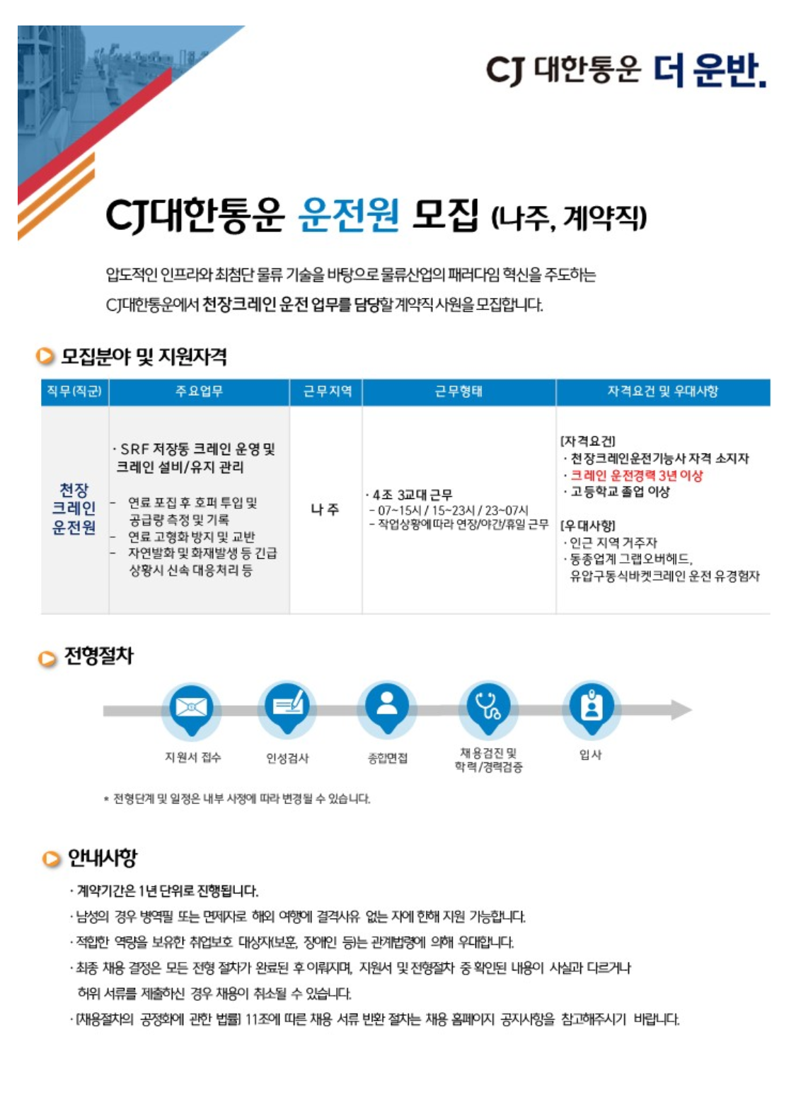 CJ´ëÇÑÅë¿î õÀåÅ©·¹ÀÎ ¿îÀü¿ø ¸ðÁý (³ªÁÖ, °è¾àÁ÷)