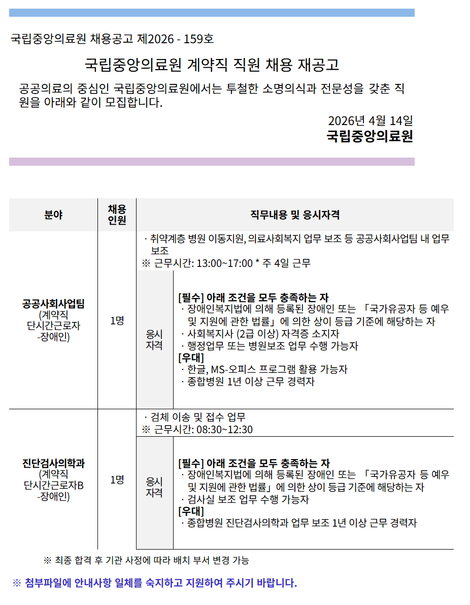 ±¹¸³Áß¾ÓÀÇ·á¿ø ä¿ë°ø°í Á¦2026 - 159È£