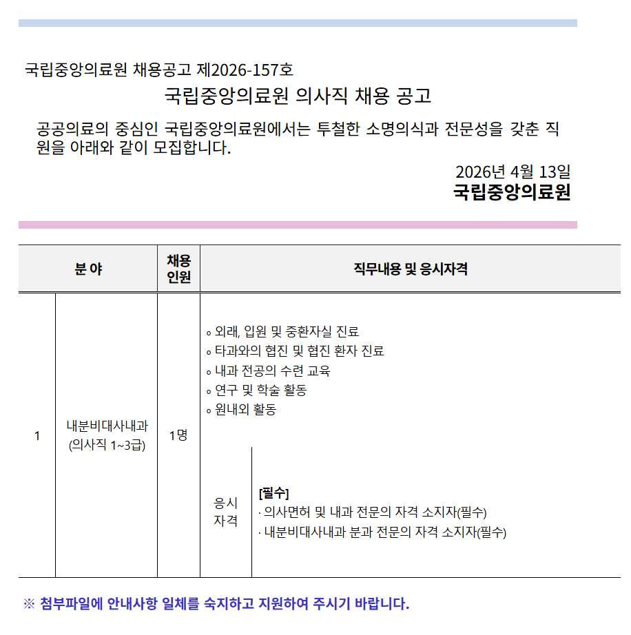 ±¹¸³Áß¾ÓÀÇ·á¿ø ä¿ë°ø°í Á¦2026-157È£