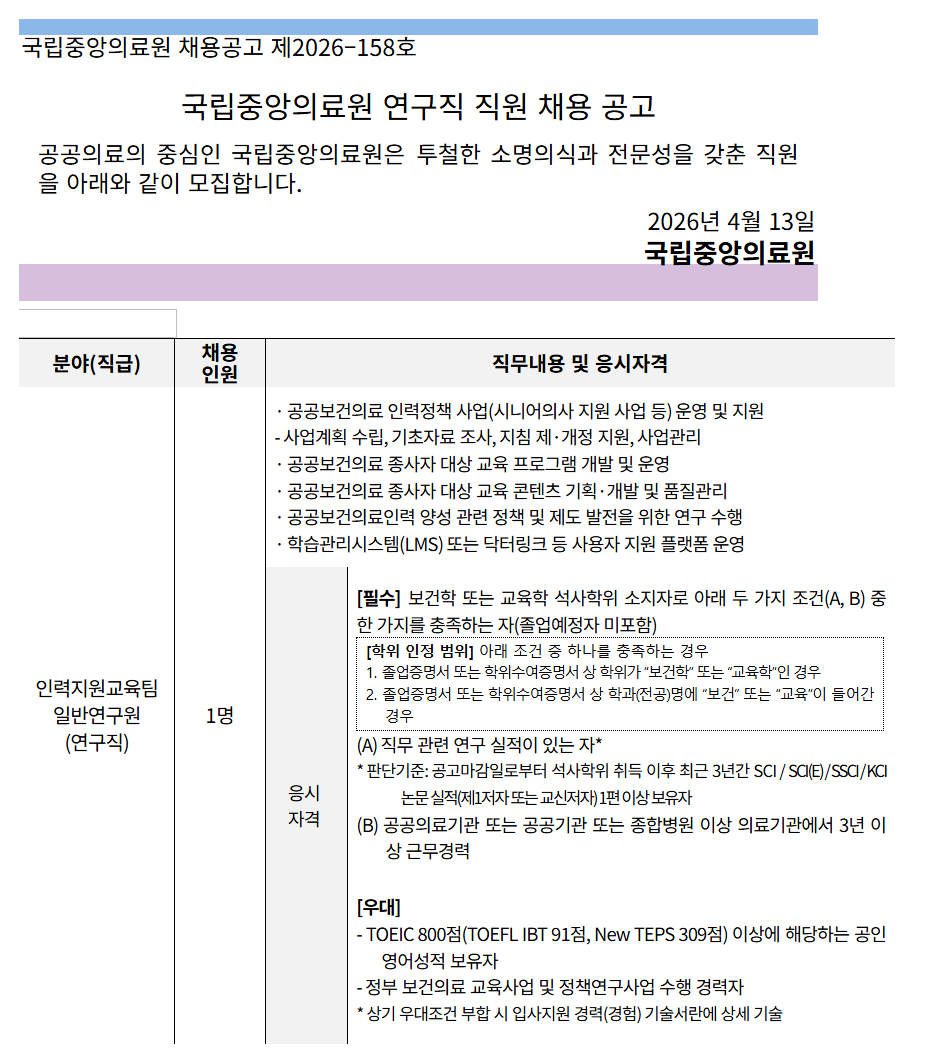 ±¹¸³Áß¾ÓÀÇ·á¿ø ä¿ë°ø°í Á¦2026–158È£