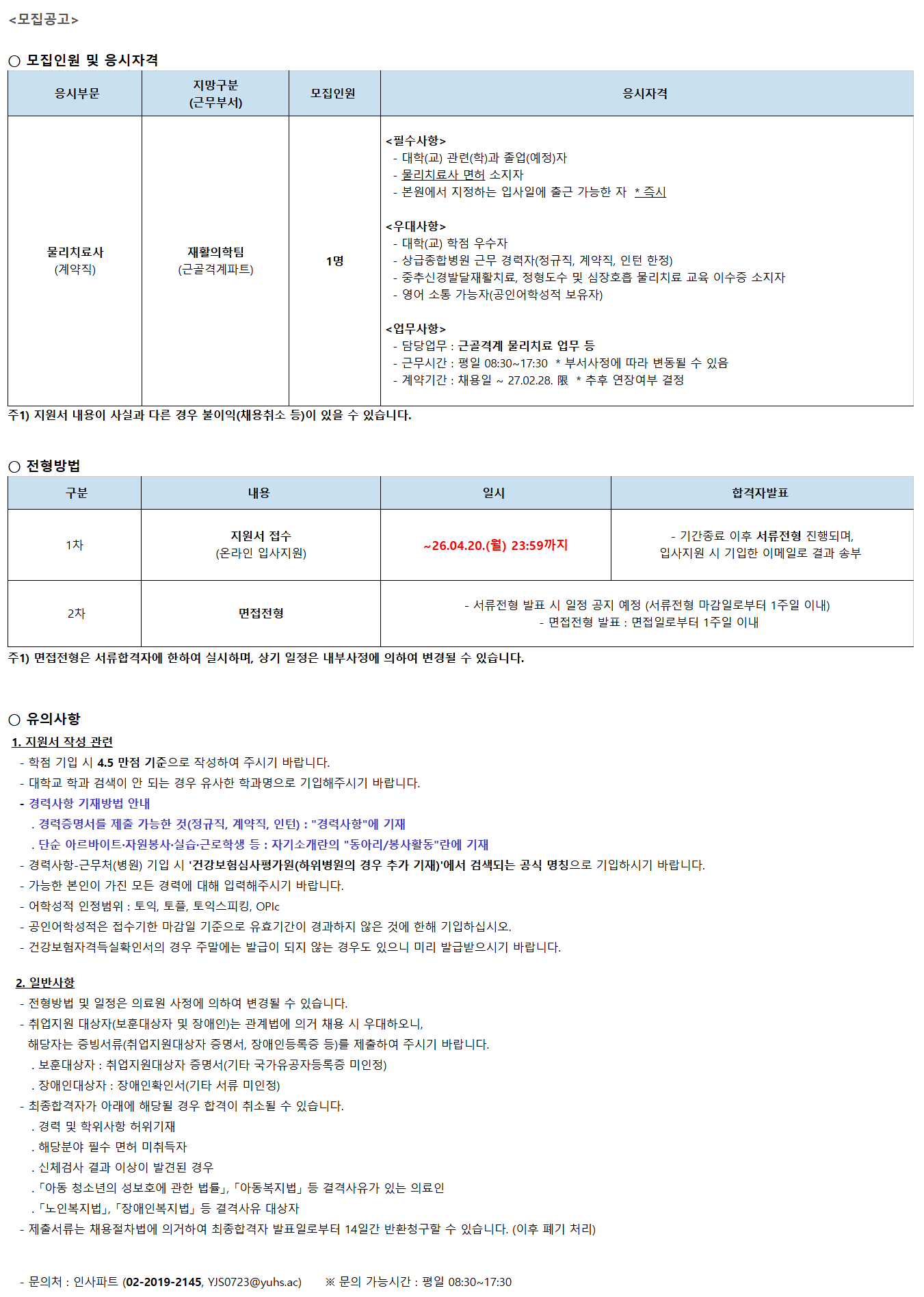<¸ðÁý°ø°í> ¡Û ¸ðÁýÀοø ¹× ÀÀ½ÃÀÚ°Ý ÀÀ½ÃºÎ¹® Áö¸Á±¸ºÐ (±Ù¹«ºÎ¼­) ¸ðÁýÀοø ÀÀ½ÃÀÚ°Ý ¹°¸®Ä¡·á»ç (°è¾àÁ÷) ÀçȰÀÇÇÐÆÀ (±Ù°ñ°Ý°èÆÄÆ®) 1¸í <Çʼö»çÇ×> - ´ëÇÐ(±³) °ü·Ã(ÇÐ)°ú Á¹¾÷(¿¹Á¤)ÀÚ - ¹°¸®Ä¡·á»ç ¸éÇã ¼ÒÁöÀÚ - º»¿ø¿¡¼­ ÁöÁ¤ÇÏ´Â ÀÔ»çÀÏ¿¡ Ãâ±Ù °¡´ÉÇÑ ÀÚ * Áï½Ã <¿ì´ë»çÇ×> - ´ëÇÐ(±³) ÇÐÁ¡ ¿ì¼öÀÚ - »ó±ÞÁ¾ÇÕº´¿ø ±Ù¹« °æ·ÂÀÚ(Á¤±ÔÁ÷, °è¾àÁ÷, ÀÎÅÏ ÇÑÁ¤) - ÁßÃ߽Űæ¹ß´ÞÀçȰġ·á, Á¤Çüµµ¼ö ¹× ½ÉÀåÈ£Èí ¹°¸®Ä¡·á ±³À° À̼öÁõ ¼ÒÁöÀÚ - ¿µ¾î ¼ÒÅë °¡´ÉÀÚ(°øÀξîÇмºÀû º¸À¯ÀÚ) <¾÷¹«»çÇ×> - ´ã´ç¾÷¹« : ±Ù°ñ°Ý°è ¹°¸®Ä¡·á ¾÷¹« µî - ±Ù¹«½Ã°£ : ÆòÀÏ 08:30~17:30 * ºÎ¼­»çÁ¤¿¡ µû¶ó º¯µ¿µÉ ¼ö ÀÖÀ½ - °è¾à±â°£ : ä¿ëÀÏ ~ 27.02.28. ùÚ * ÃßÈÄ ¿¬Àå¿©ºÎ °áÁ¤ ÁÖ1) Áö¿ø¼­ ³»¿ëÀÌ »ç½Ç°ú ´Ù¸¥ °æ¿ì ºÒÀÌÀÍ(ä¿ëÃë¼Ò µî)ÀÌ ÀÖÀ» ¼ö ÀÖ½À´Ï´Ù. ¡Û ÀüÇü¹æ¹ý ±¸ºÐ ³»¿ë ÀϽà ÇÕ°ÝÀÚ¹ßÇ¥ 1Â÷ Áö¿ø¼­ Á¢¼ö (¿Â¶óÀÎ ÀÔ»çÁö¿ø) ~26.04.20.(¿ù) 23:59±îÁö - ±â°£Á¾·á ÀÌÈÄ ¼­·ùÀüÇü ÁøÇàµÇ¸ç, ÀÔ»çÁö¿ø ½Ã ±âÀÔÇÑ À̸ÞÀÏ·Î °á°ú ¼ÛºÎ 2Â÷ ¸éÁ¢ÀüÇü - ¼­·ùÀüÇü ¹ßÇ¥ ½Ã ÀÏÁ¤ °øÁö ¿¹Á¤ (¼­·ùÀüÇü ¸¶°¨ÀϷκÎÅÍ 1ÁÖÀÏ À̳») - ¸éÁ¢ÀüÇü ¹ßÇ¥ : ¸éÁ¢ÀϷκÎÅÍ 1ÁÖÀÏ À̳» ÁÖ1) ¸éÁ¢ÀüÇüÀº ¼­·ùÇÕ°ÝÀÚ¿¡ ÇÑÇÏ¿© ½Ç½ÃÇϸç, »ó±â ÀÏÁ¤Àº ³»ºÎ»çÁ¤¿¡ ÀÇÇÏ¿© º¯°æµÉ ¼ö ÀÖ½À´Ï´Ù. ¡Û À¯ÀÇ»çÇ× 1. Áö¿ø¼­ ÀÛ¼º °ü·Ã - ÇÐÁ¡ ±âÀÔ ½Ã 4.5 ¸¸Á¡ ±âÁØÀ¸·Î ÀÛ¼ºÇÏ¿© Áֽñ⠹ٶø´Ï´Ù. - ´ëÇб³ Çаú °Ë»öÀÌ ¾È µÇ´Â °æ¿ì À¯»çÇÑ Çаú¸íÀ¸·Î ±âÀÔÇØÁֽñ⠹ٶø´Ï´Ù. - °æ·Â»çÇ× ±âÀç¹æ¹ý ¾È³» . °æ·ÂÁõ¸í¼­¸¦ Á¦Ãâ °¡´ÉÇÑ °Í(Á¤±ÔÁ÷, °è¾àÁ÷, ÀÎÅÏ) : "°æ·Â»çÇ×"¿¡ ±âÀç . ´Ü¼ø ¾Æ¸£¹ÙÀÌÆ®¡¤ÀÚ¿øºÀ»ç¡¤½Ç½À¡¤±Ù·ÎÇлý µî : ÀÚ±â¼Ò°³¶õÀÇ "µ¿¾Æ¸®/ºÀ»çȰµ¿"¶õ¿¡ ±âÀç - °æ·Â»çÇ×-±Ù¹«Ã³(º´¿ø) ±âÀÔ ½Ã '°Ç°­º¸Çè½É»çÆò°¡¿ø(ÇÏÀ§º´¿øÀÇ °æ¿ì Ãß°¡ ±âÀç)'¿¡¼­ °Ë»öµÇ´Â °ø½Ä ¸íĪÀ¸·Î ±âÀÔÇϽñ⠹ٶø´Ï´Ù. - °¡´ÉÇÑ º»ÀÎÀÌ °¡Áø ¸ðµç °æ·Â¿¡ ´ëÇØ ÀÔ·ÂÇØÁֽñ⠹ٶø´Ï´Ù. - ¾îÇмºÀû ÀÎÁ¤¹üÀ§ : ÅäÀÍ, ÅäÇÃ, ÅäÀͽºÇÇÅ·, OPIc - °øÀξîÇмºÀûÀº Á¢¼ö±âÇÑ ¸¶°¨ÀÏ ±âÁØÀ¸·Î À¯È¿±â°£ÀÌ °æ°úÇÏÁö ¾ÊÀº °Í¿¡ ÇÑÇØ ±âÀÔÇϽʽÿÀ. - °Ç°­º¸ÇèÀڰݵæ½ÇÈ®Àμ­ÀÇ °æ¿ì ÁÖ¸»¿¡´Â ¹ß±ÞÀÌ µÇÁö ¾Ê´Â °æ¿ìµµ ÀÖÀ¸´Ï ¹Ì¸® ¹ß±Þ¹ÞÀ¸½Ã±â ¹Ù¶ø´Ï´Ù. 2. ÀϹݻçÇ× - ÀüÇü¹æ¹ý ¹× ÀÏÁ¤Àº ÀÇ·á¿ø »çÁ¤¿¡ ÀÇÇÏ¿© º¯°æµÉ ¼ö ÀÖ½À´Ï´Ù. - Ãë¾÷Áö¿ø ´ë»óÀÚ(º¸ÈÆ´ë»óÀÚ ¹× Àå¾ÖÀÎ)´Â °ü°è¹ý¿¡ ÀǰŠä¿ë ½Ã ¿ì´ëÇÏ¿À´Ï, ÇØ´çÀÚ´Â Áõºù¼­·ù(Ãë¾÷Áö¿ø´ë»óÀÚ Áõ¸í¼­, Àå¾ÖÀεî·ÏÁõ µî)¸¦ Á¦ÃâÇÏ¿© Áֽñ⠹ٶø´Ï´Ù. . º¸ÈÆ´ë»óÀÚ : Ãë¾÷Áö¿ø´ë»óÀÚ Áõ¸í¼­(±âŸ ±¹°¡À¯°øÀÚµî·ÏÁõ ¹ÌÀÎÁ¤) . Àå¾ÖÀδë»óÀÚ : Àå¾ÖÀÎÈ®Àμ­(±âŸ ¼­·ù ¹ÌÀÎÁ¤) - ÃÖÁ¾ÇÕ°ÝÀÚ°¡ ¾Æ·¡¿¡ ÇØ´çµÉ °æ¿ì ÇÕ°ÝÀÌ Ãë¼ÒµÉ ¼ö ÀÖ½À´Ï´Ù. . °æ·Â ¹× ÇÐÀ§»çÇ× ÇãÀ§±âÀç . ÇØ´çºÐ¾ß Çʼö ¸éÇã ¹ÌÃëµæÀÚ . ½Åü°Ë»ç °á°ú ÀÌ»óÀÌ ¹ß°ßµÈ °æ¿ì . ¡¸¾Æµ¿ û¼Ò³âÀÇ ¼ºº¸È£¿¡ °üÇÑ ¹ý·ü¡¹, ¡¸¾Æµ¿º¹Áö¹ý¡¹ µî °á°Ý»çÀ¯°¡ ÀÖ´Â ÀÇ·áÀÎ . ¡¸³ëÀκ¹Áö¹ý¡¹, ¡¸Àå¾ÖÀκ¹Áö¹ý¡¹ µî °á°Ý»çÀ¯ ´ë»óÀÚ - Á¦Ãâ¼­·ù´Â ä¿ëÀýÂ÷¹ý¿¡ ÀǰÅÇÏ¿© ÃÖÁ¾ÇÕ°ÝÀÚ ¹ßÇ¥ÀϷκÎÅÍ 14Àϰ£ ¹Ýȯû±¸ÇÒ ¼ö ÀÖ½À´Ï´Ù. (ÀÌÈÄ Æó±â ó¸®) - ¹®ÀÇó : ÀλçÆÄÆ® (***-****-****, ******@*******.***) ¡Ø ¹®ÀÇ °¡´É½Ã°£ : ÆòÀÏ 08:30~17:30