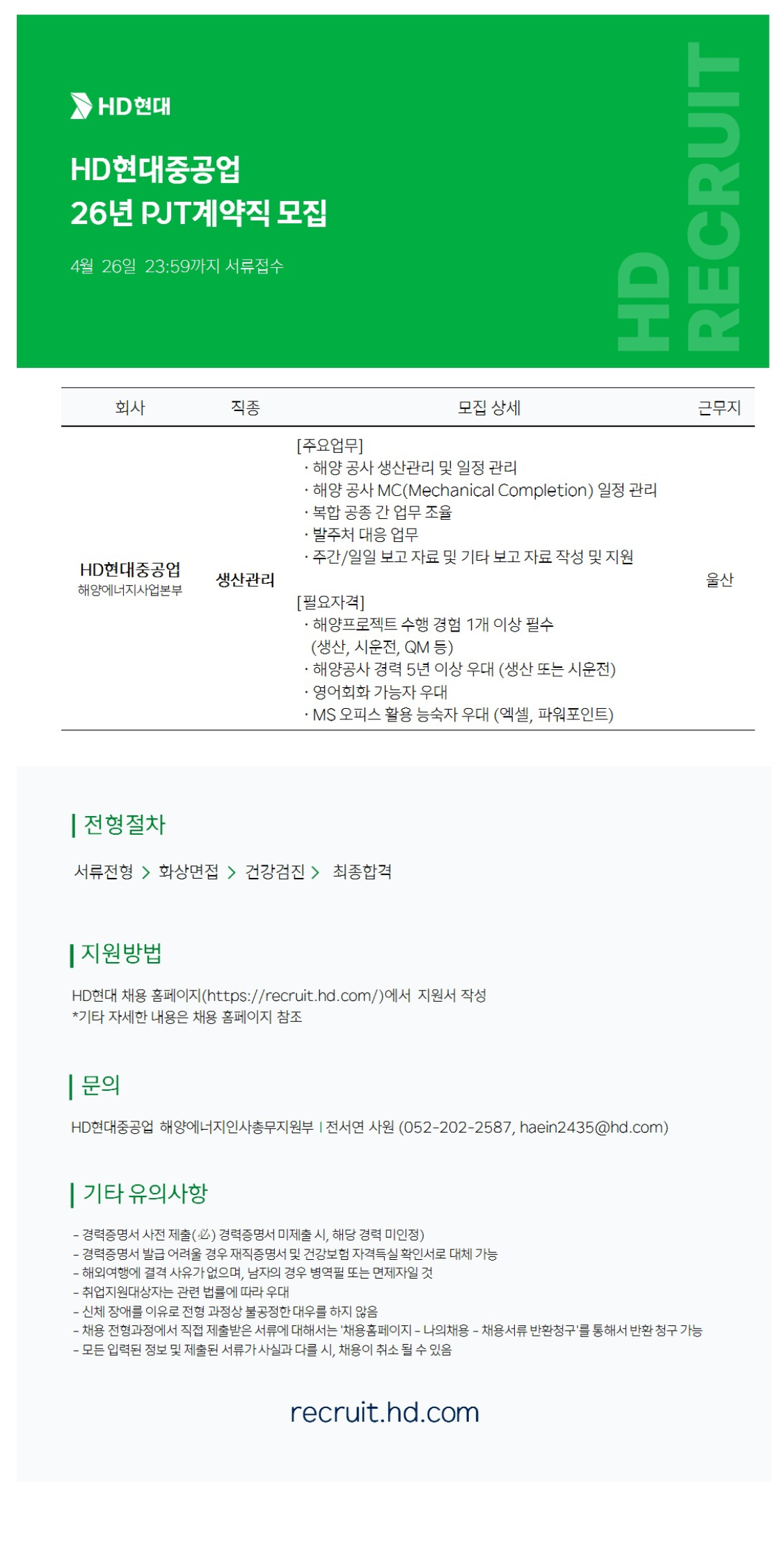 [HDÇö´ëÁß°ø¾÷] ÇØ¾ç¿¡³ÊÁö»ç¾÷º»ºÎ »ý»ê°ü¸® ¸ðÁý °ø°í(PJT°è¾àÁ÷)