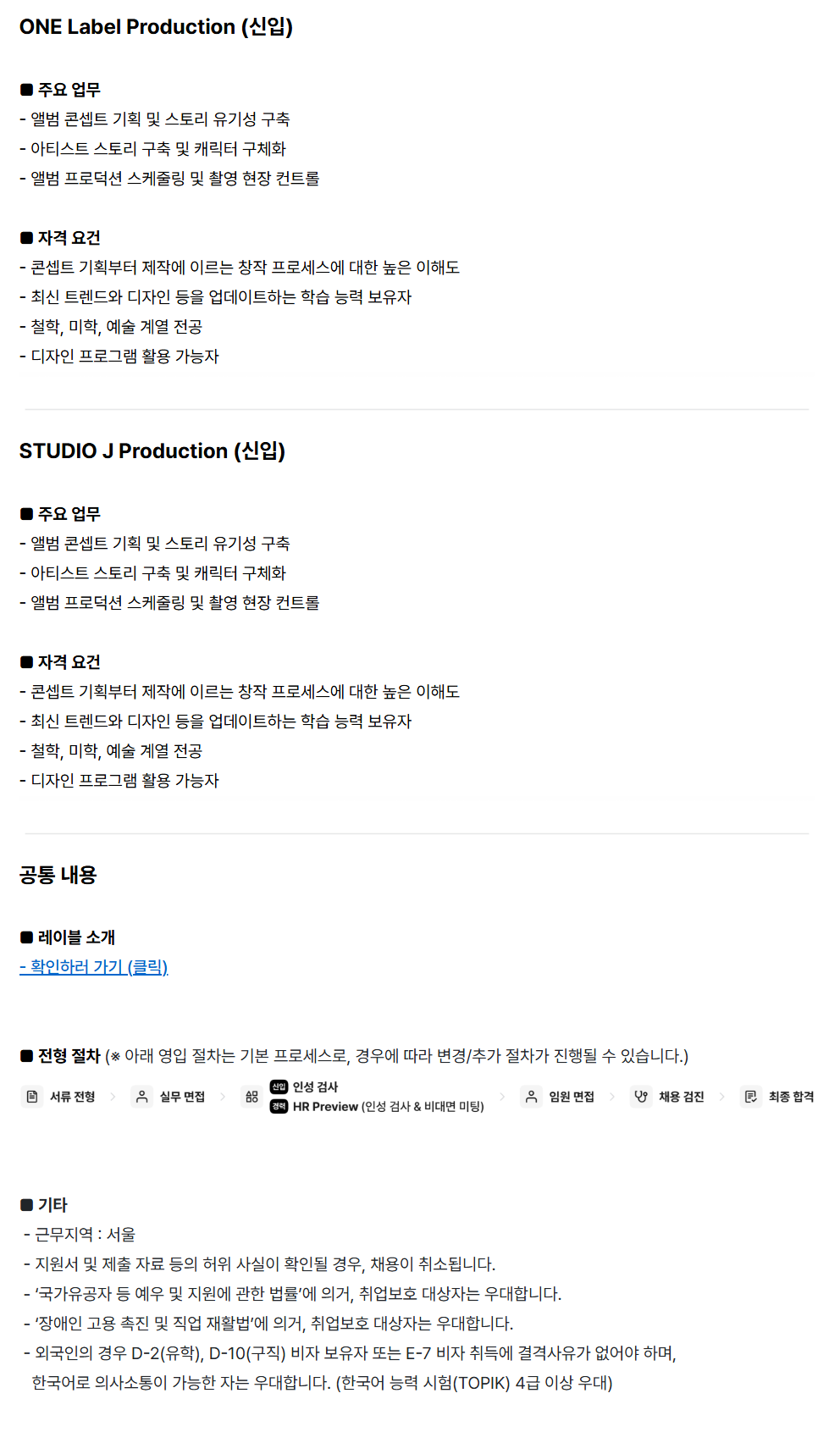 [JYP ENTERTAINMENT] Production (½ÅÀÔ) ONE Label ​Production ​(½ÅÀÔ) ¡á ​ÁÖ¿ä ¾÷¹« - ​¾Ù¹ü ÄܼÁÆ® ±âȹ ¹× ​½ºÅ丮 ​À¯±â¼º ±¸Ãà - ​¾ÆÆ¼½ºÆ® ½ºÅ丮 ±¸Ãà ​¹× ij¸¯ÅÍ ​±¸Ã¼È­ - ​¾Ù¹ü ÇÁ·Î´ö¼Ç ​½ºÄÉÁÙ¸µ ​¹× ​ÃÔ¿µ ÇöÀå ÄÁÆ®·Ñ ¡á ​ÀÚ°Ý ​¿ä°Ç - ÄܼÁÆ® ±âȹºÎÅÍ ​Á¦ÀÛ¿¡ ​À̸£´Â ​âÀÛ ÇÁ·Î¼¼½º¿¡ ´ëÇÑ ​³ôÀº ÀÌÇØµµ - ​ÃֽŠ​Æ®·»µå¿Í µðÀÚÀÎ ​µîÀ» ¾÷µ¥ÀÌÆ®ÇÏ´Â ​ÇнÀ ​´É·Â º¸À¯ÀÚ - öÇÐ, ​¹ÌÇÐ, ¿¹¼ú ​°è¿­ Àü°ø - µðÀÚÀÎ ÇÁ·Î±×·¥ Ȱ¿ë °¡´ÉÀÚ STUDIO J Production (½ÅÀÔ) ¡á ÁÖ¿ä ¾÷¹« - ¾Ù¹ü ÄܼÁÆ® ±âȹ ¹× ½ºÅ丮 À¯±â¼º ±¸Ãà - ¾ÆÆ¼½ºÆ® ½ºÅ丮 ±¸Ãà ¹× Ä³¸¯ÅÍ ±¸Ã¼È­ - ¾Ù¹ü ÇÁ·Î´ö¼Ç ½ºÄÉÁÙ¸µ ¹× ÃÔ¿µ ÇöÀå ÄÁÆ®·Ñ ¡á ÀÚ°Ý ¿ä°Ç - ÄܼÁÆ® ±âȹºÎÅÍ Á¦ÀÛ¿¡ À̸£´Â âÀÛ ÇÁ·Î¼¼½º¿¡ ´ëÇÑ ³ôÀº ÀÌÇØµµ - ÃֽŠƮ·»µå¿Í µðÀÚÀÎ µîÀ» ¾÷µ¥ÀÌÆ®ÇÏ´Â ÇнÀ ´É·Â º¸À¯ÀÚ - öÇÐ, ¹ÌÇÐ, ¿¹¼ú °è¿­ Àü°ø - µðÀÚÀÎ ÇÁ·Î±×·¥ Ȱ¿ë °¡´ÉÀÚ