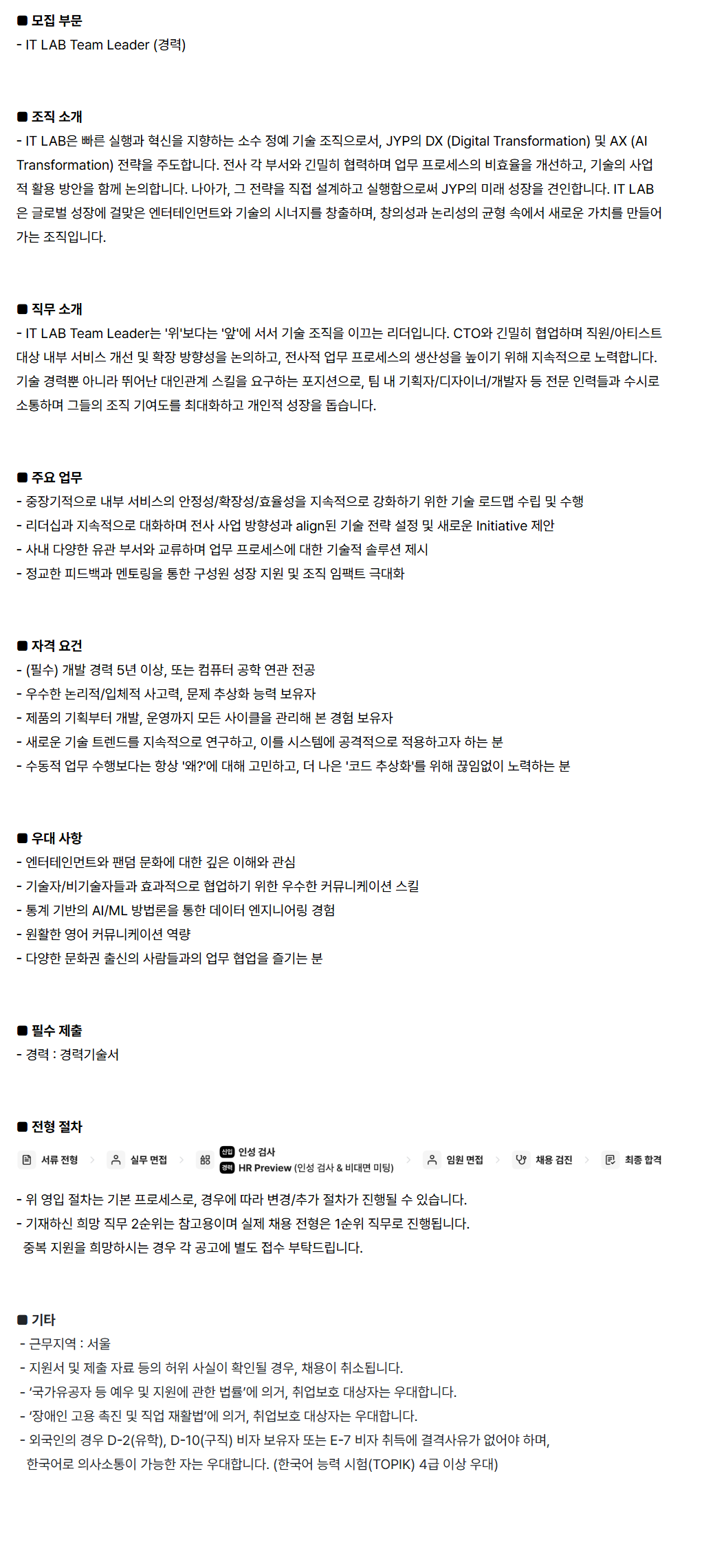 [JYP ENTERTAINMENT] IT LAB Team Leader (°æ·Â)