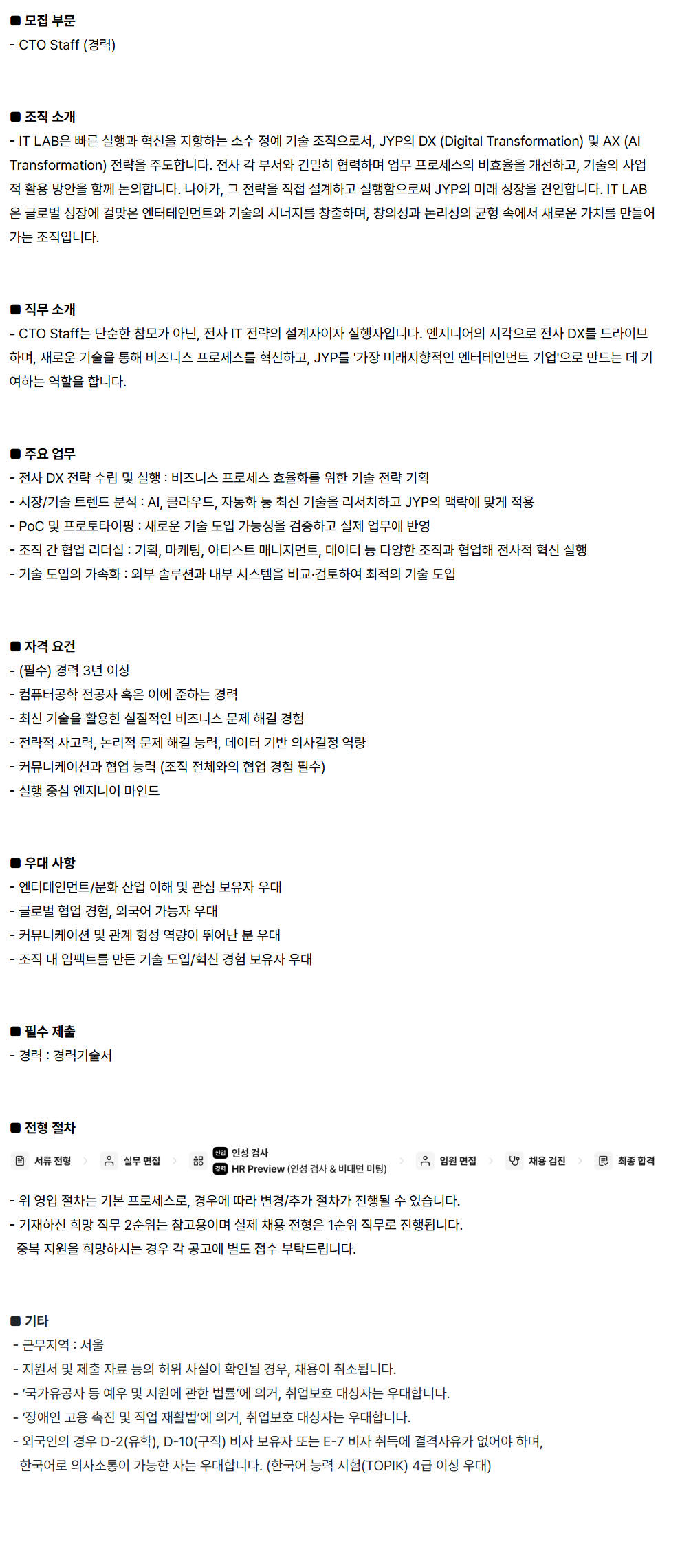 - CTO Staff´Â ´Ü¼øÇÑ Âü¸ð°¡ ¾Æ´Ñ, Àü»ç IT Àü·«ÀÇ ¼³°èÀÚÀÌÀÚ ½ÇÇàÀÚÀÔ´Ï´Ù. ¿£Áö´Ï¾îÀÇ ½Ã°¢À¸·Î Àü»ç DX¸¦ µå¶óÀ̺êÇϸç, »õ·Î¿î ±â¼úÀ» ÅëÇØ ºñÁî´Ï½º ÇÁ·Î¼¼½º¸¦ Çõ½ÅÇϰí, JYP¸¦ '°¡Àå ¹Ì·¡ÁöÇâÀûÀÎ ¿£ÅÍÅ×ÀÎ¸ÕÆ® ±â¾÷'À¸·Î ¸¸µå´Â µ¥ ±â¿©ÇÏ´Â ¿ªÇÒÀ» ÇÕ´Ï´Ù.
