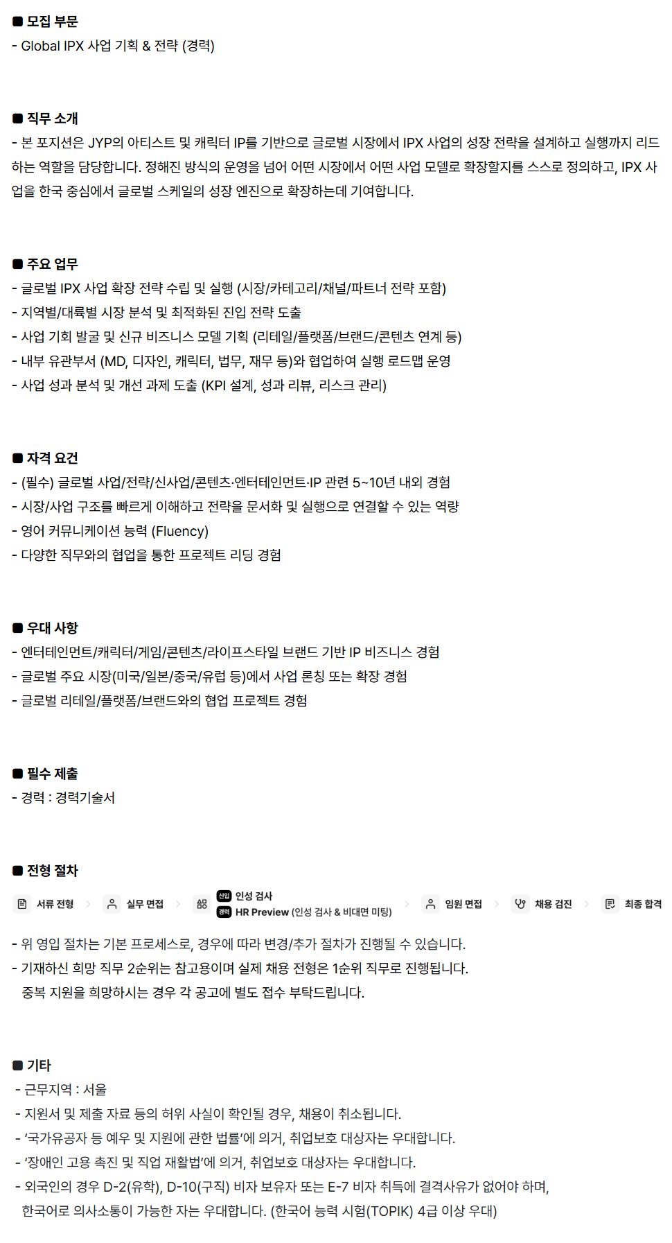 - º» Æ÷Áö¼ÇÀº JYPÀÇ ¾ÆÆ¼½ºÆ® ¹× ij¸¯ÅÍ IP¸¦ ±â¹ÝÀ¸·Î ±Û·Î¹ú ½ÃÀå¿¡¼ IPX »ç¾÷ÀÇ ¼ºÀå Àü·«À» ¼³°èÇÏ°í ½ÇÇà±îÁö ¸®µåÇÏ´Â ¿ªÇÒÀ» ´ã´çÇÕ´Ï´Ù. Á¤ÇØÁø ¹æ½ÄÀÇ ¿î¿µÀ» ³Ñ¾î ¾î¶² ½ÃÀå¿¡¼ ¾î¶² »ç¾÷ ¸ðµ¨·Î È®ÀåÇÒÁö¸¦ ½º½º·Î Á¤ÀÇÇϰí, IPX »ç¾÷À» Çѱ¹ Á߽ɿ¡¼ ±Û·Î¹ú ½ºÄÉÀÏÀÇ ¼ºÀå ¿£ÁøÀ¸·Î È®ÀåÇϴµ¥ ±â¿©ÇÕ´Ï´Ù.