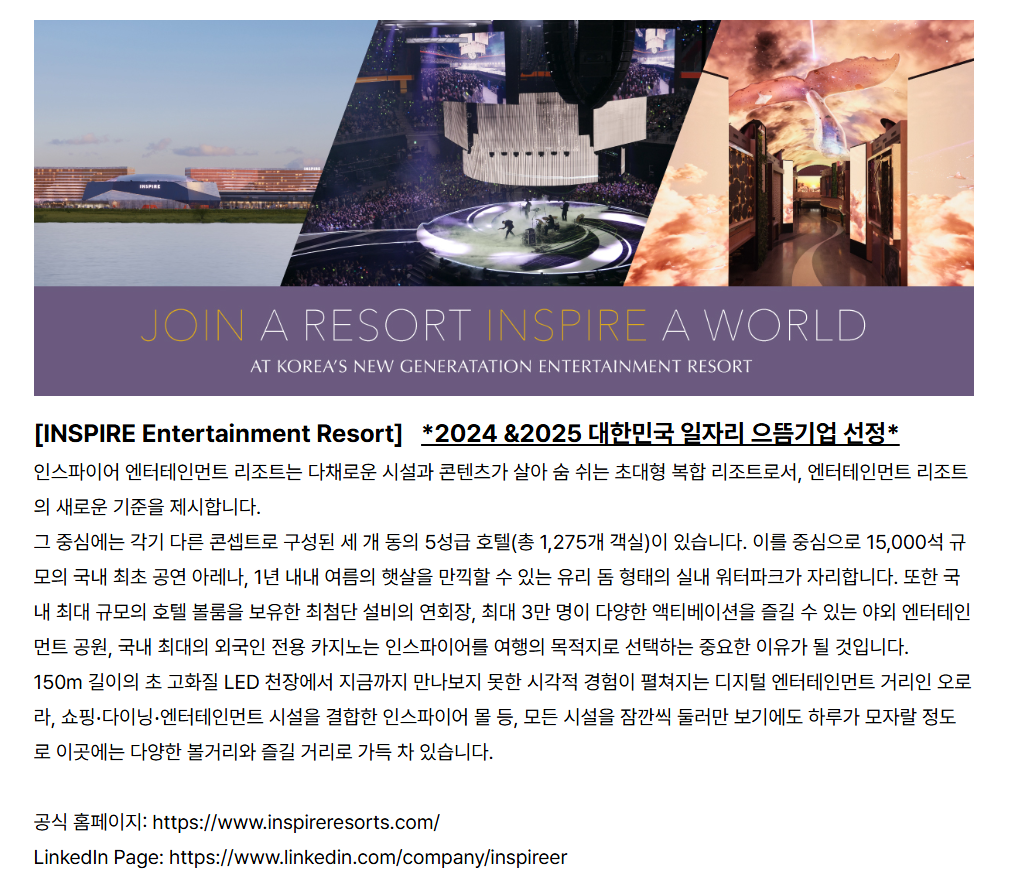 Inspire Integrated Resort Co., Ltd.,´Â ¿ÀÇ µÈ Æ÷Áö¼Ç¿¡ ´ëÇØ ÀÇ·ÚÇÏÁö ¾ÊÀº ÀÎÀç¸ðÁý¾÷ü (ÇìµåÇåÅÍ, ¼Ä¡Æß µî)ÀÇ µµ¿òÀ» ¹ÞÁö ¾Ê½À´Ï´Ù. ÇØ´ç Æ÷Áö¼Ç¿¡ ´ëÇÑ À¯È¿ÇÑ ¼¸é ÀÇ·Ú ¿äû ¾øÀÌ ÀÎÀç¸ðÁý ¾÷ü°¡ ÀÚÀÇÀûÀ¸·Î ´ç»çÀÇ Á÷¿ø¿¡°Ô Á¦ÃâÇÑ ¸ðµç À̷¼´Â ´ç»çÀÇ Àç»êÀ¸·Î °£Áֵ˴ϴÙ. ¶ÇÇÑ ±âÁ¸¿¡ ´ç»ç¿Í °è¾àÀÌ Ã¼°áµÈ ÀÎÀç¸ðÁý¾÷ü¶ó ÇÏ¿©µµ Á÷Á¢ÀûÀ¸·Î ¼¸é ÀÇ·ÚÇÑ Á÷À§¿¡ ´ëÇØ¼¸¸ À¯È¿Çϸç, ±×·¸Áö ¾ÊÀ» °æ¿ì ´ëÇà¾÷ü°¡ ÃßõÇÏ¿© ´ç»ç°¡ °í¿ëÇÑ Èĺ¸ÀÚ°¡ ÀÖ´õ¶óµµ ¼ö¼ö·á°¡ Áö±ÞµÇÁö ¾ÊÀ½À» À¯³äÇÏ¿© Áֽñ⠹ٶø´Ï´Ù.