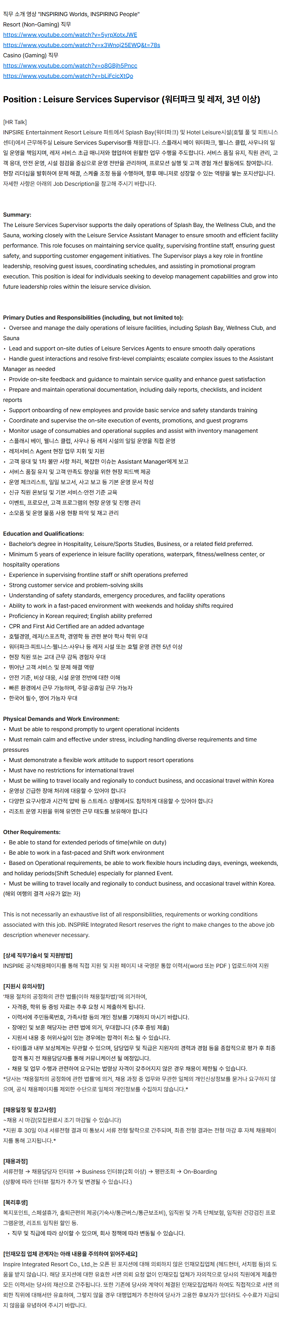 This is not necessarily an exhaustive list of all responsibilities, requirements or working conditions associated with this job. INSPIRE Integrated Resort reserves the right to make changes to the above job description whenever necessary.