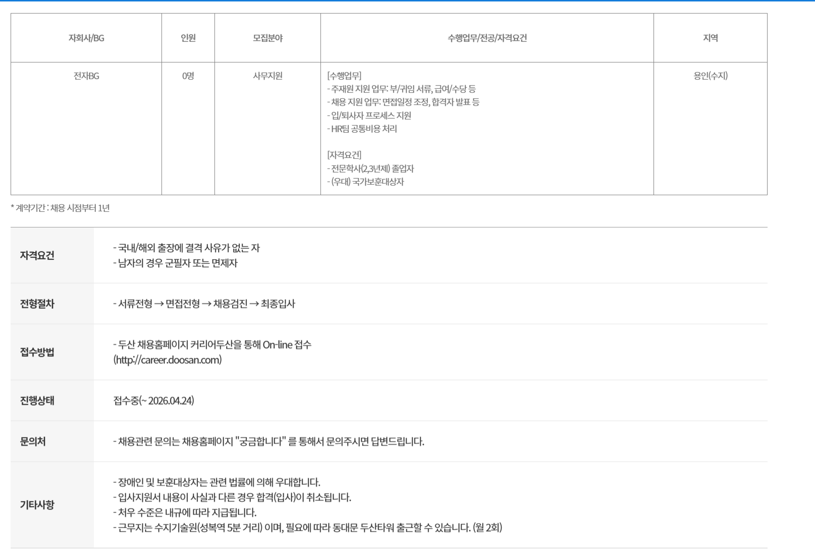 ÀÚȸ»ç/BG ÀüÀÚBG Àοø 0¸í ¸ðÁýºÐ¾ß »ç¹«Áö¿ø ¼öÇà¾÷¹«/Àü°ø/ÀÚ°Ý¿ä°Ç [¼öÇà¾÷¹«] - ÁÖÀç¿ø Áö¿ø ¾÷¹«: ºÎ/±ÍÀÓ ¼­·ù, ±Þ¿©/¼ö´ç µî - ä¿ë Áö¿ø ¾÷¹«: ¸éÁ¢ÀÏÁ¤ Á¶Á¤, ÇÕ°ÝÀÚ ¹ßÇ¥ µî - ÀÔ/Åð»çÀÚ ÇÁ·Î¼¼½º Áö¿ø - HRÆÀ °øÅëºñ¿ë ó¸® [ÀÚ°Ý¿ä°Ç] - Àü¹®Çлç(2,3³âÁ¦) Á¹¾÷ÀÚ - (¿ì´ë) ±¹°¡º¸ÈÆ´ë»óÀÚ Áö¿ª ¿ëÀÎ(¼öÁö)