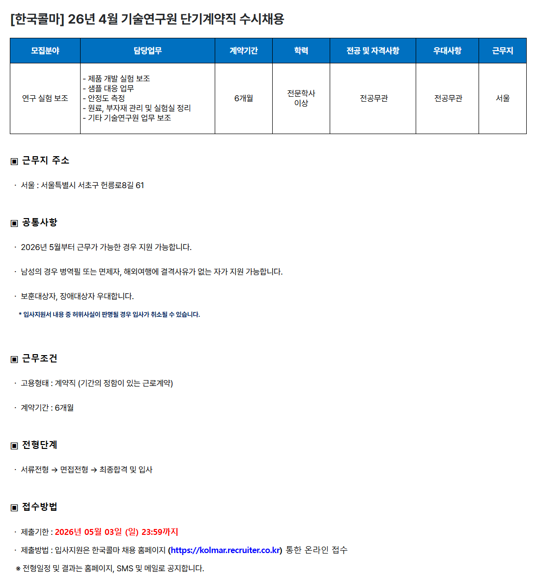[Çѱ¹Äݸ¶] 26³â 4¿ù ±â¼ú¿¬±¸¿ø ´Ü±â°è¾àÁ÷ ¼ö½Ãä¿ë