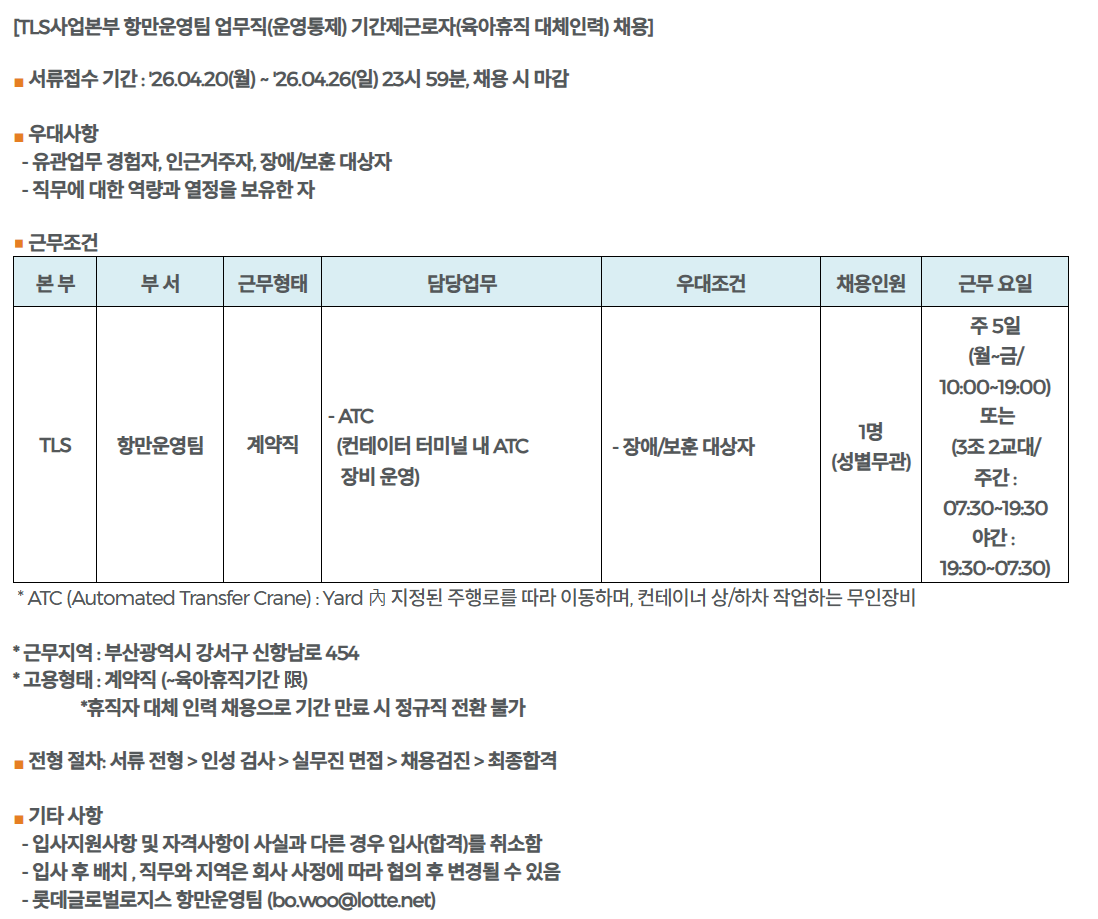 [TLS»ç¾÷º»ºÎ Ç׸¸¿î¿µÆÀ ¾÷¹«Á÷(¿î¿µÅëÁ¦) ±â°£Á¦±Ù·ÎÀÚ(À°¾ÆÈÞÁ÷ ´ëüÀηÂ) ä¿ë]