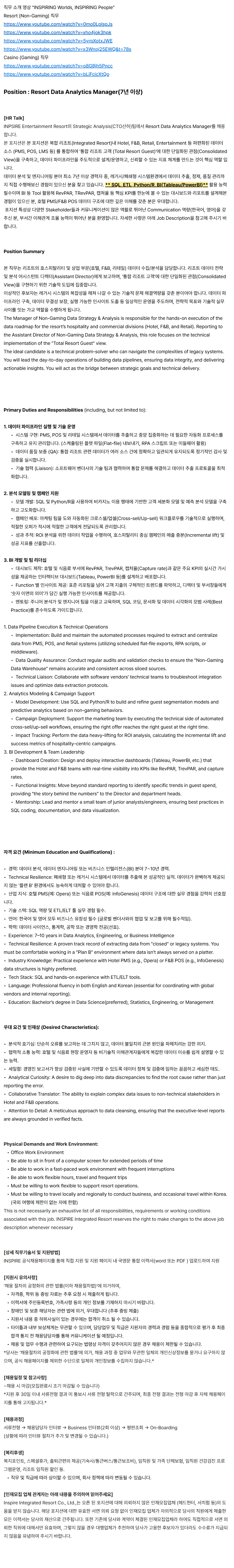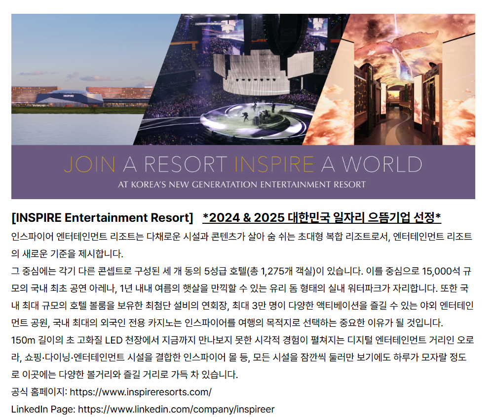 INPSIRE Entertainment ResortÀÇ Strategic Analysis(CTO»êÇÏ)ÆÀ¿¡¼ Resort Data Analytics Manager¸¦ ä¿ëÇÕ´Ï´Ù.
