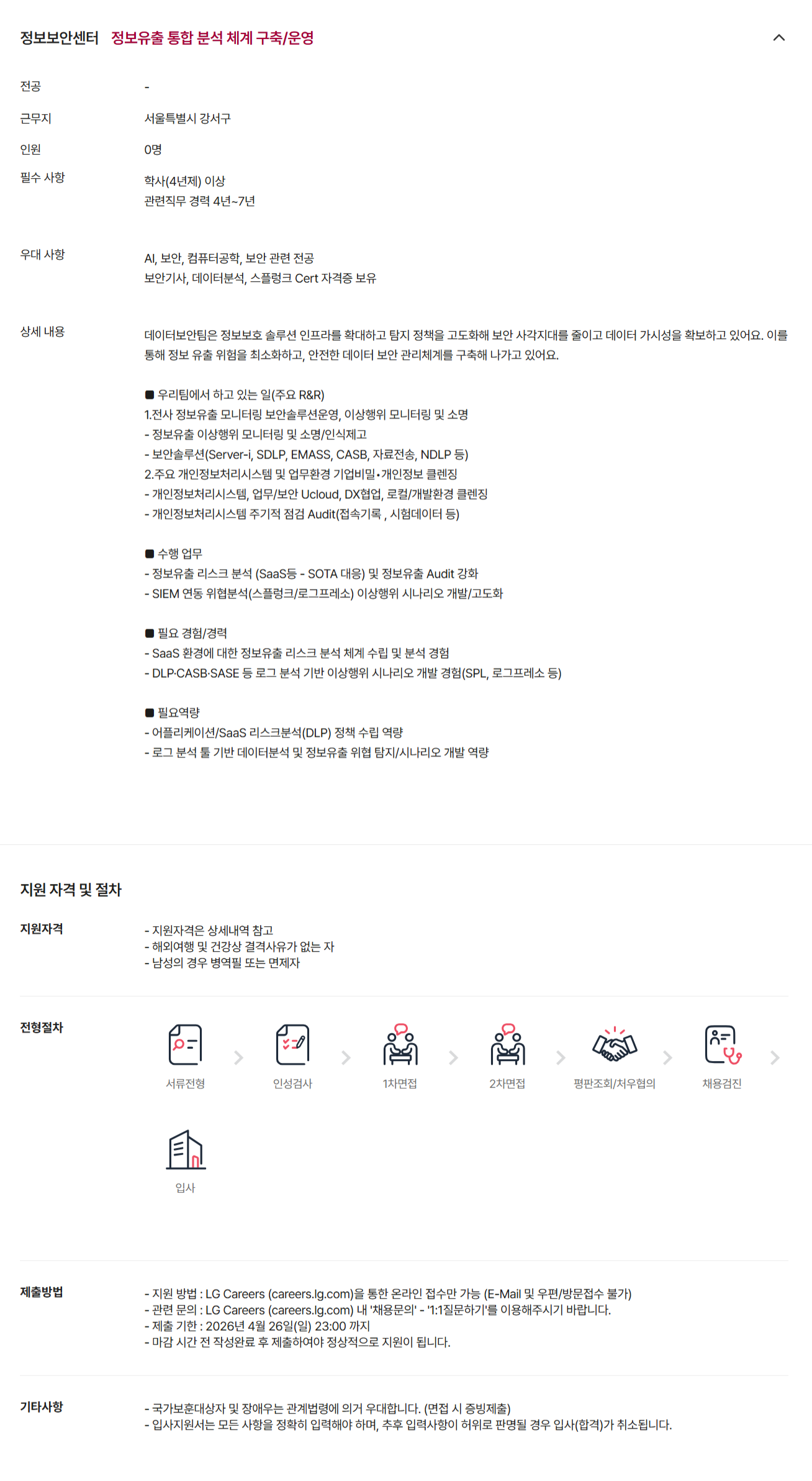 ±Ù¹«Áö ¼­¿ïƯº°½Ã °­¼­±¸ Àοø 0¸í Çʼö »çÇ× Çлç(4³âÁ¦) ÀÌ»ó °ü·ÃÁ÷¹« °æ·Â 4³â~7³â ¿ì´ë »çÇ× AI, º¸¾È, ÄÄÇ»ÅͰøÇÐ, º¸¾È °ü·Ã Àü°ø º¸¾È±â»ç, µ¥ÀÌÅͺм®, ½ºÇ÷·Å© Cert ÀÚ°ÝÁõ º¸À¯ »ó¼¼ ³»¿ë µ¥ÀÌÅͺ¸¾ÈÆÀÀº Á¤º¸º¸È£ ¼Ö·ç¼Ç ÀÎÇÁ¶ó¸¦ È®´ëÇϰí ŽÁö Á¤Ã¥À» °íµµÈ­ÇØ º¸¾È »ç°¢Áö´ë¸¦ ÁÙÀÌ°í µ¥ÀÌÅÍ °¡½Ã¼ºÀ» È®º¸Çϰí ÀÖ¾î¿ä. À̸¦ ÅëÇØ Á¤º¸ À¯Ãâ À§ÇèÀ» ÃÖ¼ÒÈ­Çϰí, ¾ÈÀüÇÑ µ¥ÀÌÅÍ º¸¾È °ü¸®Ã¼°è¸¦ ±¸ÃàÇØ ³ª°¡°í ÀÖ¾î¿ä. ¡á ¿ì¸®ÆÀ¿¡¼­ Çϰí ÀÖ´Â ÀÏ(ÁÖ¿ä R&R) 1.Àü»ç Á¤º¸À¯Ãâ ¸ð´ÏÅ͸µ º¸¾È¼Ö·ç¼Ç¿î¿µ, ÀÌ»óÇàÀ§ ¸ð´ÏÅ͸µ ¹× ¼Ò¸í - Á¤º¸À¯Ãâ ÀÌ»óÇàÀ§ ¸ð´ÏÅ͸µ ¹× ¼Ò¸í/ÀνÄÁ¦°í - º¸¾È¼Ö·ç¼Ç(Server-i, SDLP, EMASS, CASB, ÀÚ·áÀü¼Û, NDLP µî) 2.ÁÖ¿ä °³ÀÎÁ¤º¸Ã³¸®½Ã½ºÅÛ ¹× ¾÷¹«È¯°æ ±â¾÷ºñ¹Ð•°³ÀÎÁ¤º¸ Ŭ·»Â¡ - °³ÀÎÁ¤º¸Ã³¸®½Ã½ºÅÛ, ¾÷¹«/º¸¾È Ucloud, DXÇù¾÷, ·ÎÄÃ/°³¹ßȯ°æ Ŭ·»Â¡ - °³ÀÎÁ¤º¸Ã³¸®½Ã½ºÅÛ ÁÖ±âÀû Á¡°Ë Audit(Á¢¼Ó±â·Ï , ½ÃÇèµ¥ÀÌÅÍ µî) ¡á ¼öÇà ¾÷¹« - Á¤º¸À¯Ãâ ¸®½ºÅ© ºÐ¼® (SaaSµî - SOTA ´ëÀÀ) ¹× Á¤º¸À¯Ãâ Audit °­È­ - SIEM ¿¬µ¿ À§ÇùºÐ¼®(½ºÇ÷·Å©/·Î±×ÇÁ·¹¼Ò) ÀÌ»óÇàÀ§ ½Ã³ª¸®¿À °³¹ß/°íµµÈ­ ¡á ÇÊ¿ä °æÇè/°æ·Â - SaaS ȯ°æ¿¡ ´ëÇÑ Á¤º¸À¯Ãâ ¸®½ºÅ© ºÐ¼® ü°è ¼ö¸³ ¹× ºÐ¼® °æÇè - DLP¡¤CASB¡¤SASE µî ·Î±× ºÐ¼® ±â¹Ý ÀÌ»óÇàÀ§ ½Ã³ª¸®¿À °³¹ß °æÇè(SPL, ·Î±×ÇÁ·¹¼Ò µî) ¡á Çʿ俪·® - ¾îÇø®ÄÉÀ̼Ç/SaaS ¸®½ºÅ©ºÐ¼®(DLP) Á¤Ã¥ ¼ö¸³ ¿ª·® - ·Î±× ºÐ¼® Åø ±â¹Ý µ¥ÀÌÅͺм® ¹× Á¤º¸À¯Ãâ À§Çù ŽÁö/½Ã³ª¸®¿À °³¹ß ¿ª·®