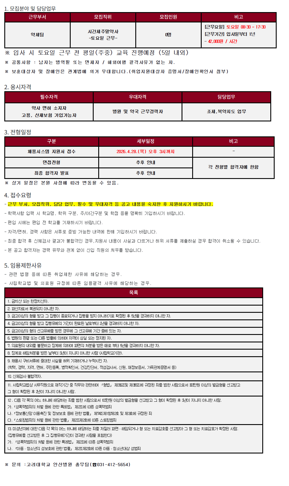 [¾È»êº´¿ø26-34] ¾àÁ¦ÆÀ ½Ã°£Á¦ÁÖ¸»¾à»ç(Åä¿äÀÏ ±Ù¹«) ¸ðÁý