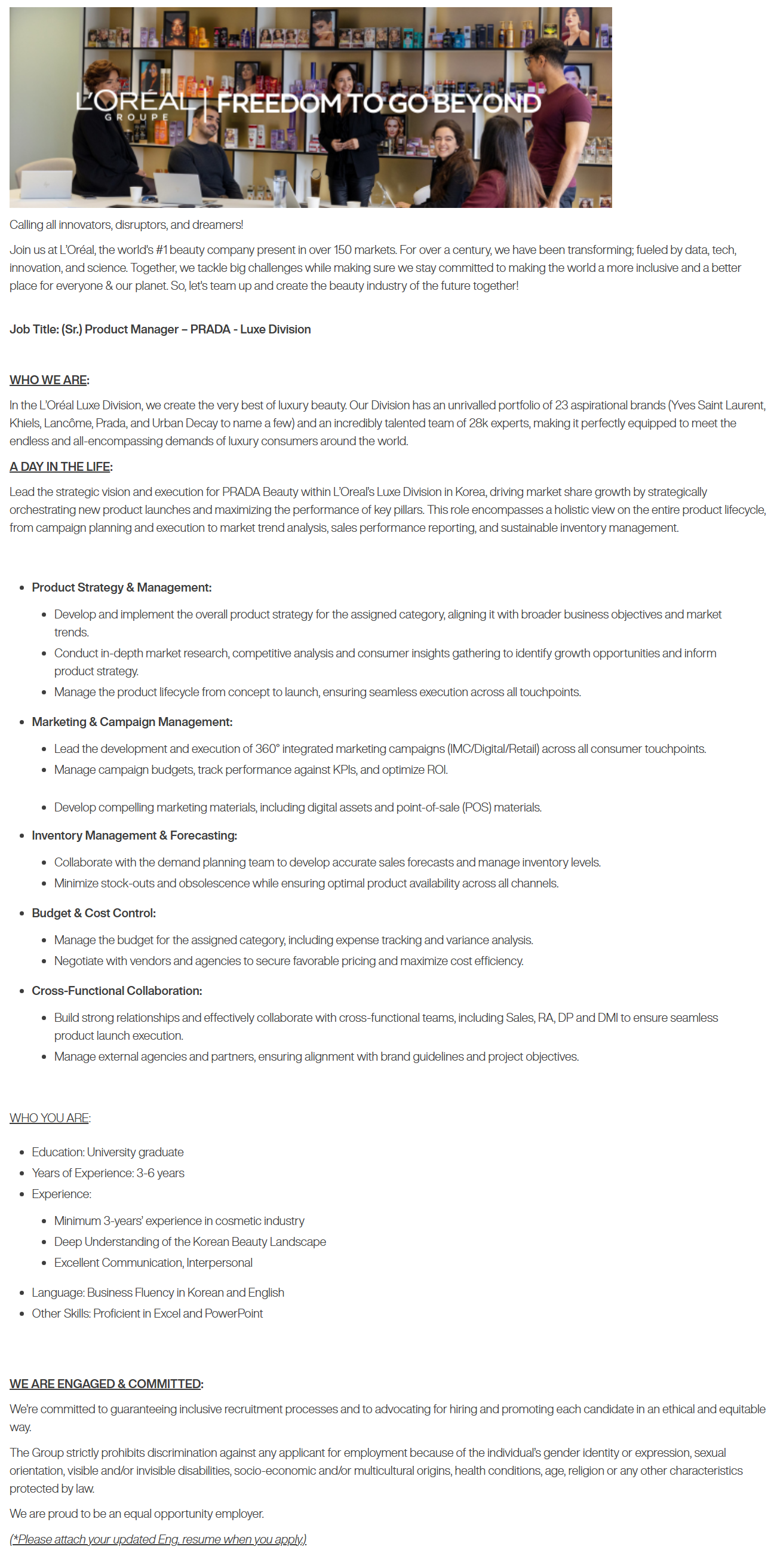 Lead the strategic vision and execution for PRADA Beauty within L¡¯Oreal¡¯s Luxe Division in Korea, driving market share growth by strategically orchestrating new product launches and maximizing the performance of key pillars. This role encompasses a holistic view on the entire product lifecycle, from campaign planning and execution to market trend analysis, sales performance reporting, and sustainable inventory management.