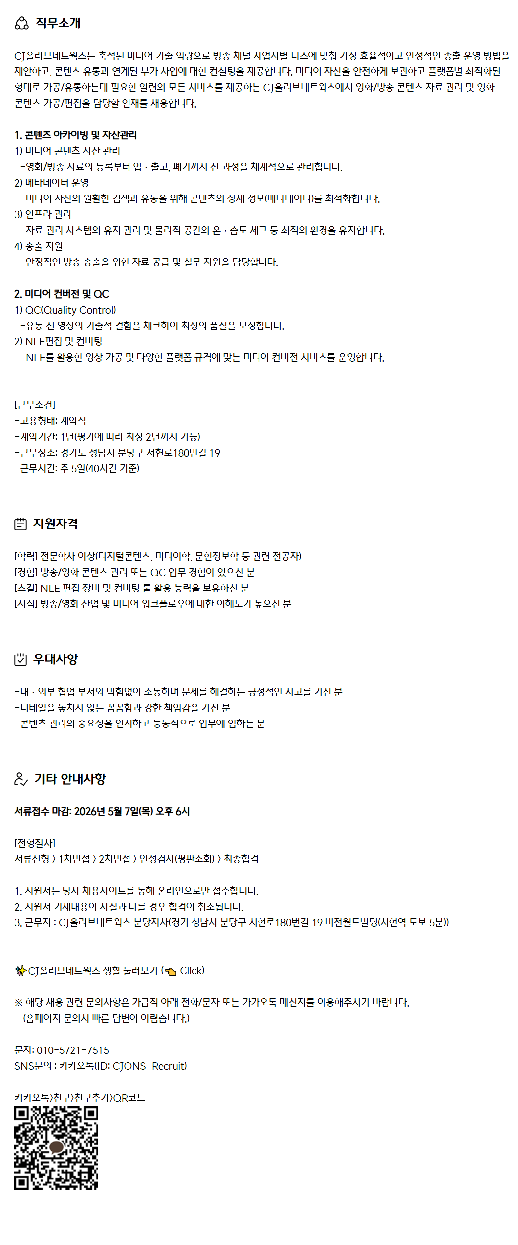 CJ¿Ã¸®ºê³×Æ®¿÷½º´Â ÃàÀûµÈ ¹Ìµð¾î ±â¼ú ¿ª·®À¸·Î ¹æ¼Û ä³Î »ç¾÷ÀÚº° ´ÏÁî¿¡ ¸ÂÃç °¡Àå È¿À²ÀûÀÌ°í ¾ÈÁ¤ÀûÀÎ ¼ÛÃ⠿ ¹æ¹ýÀ» Á¦¾ÈÇϰí, ÄÜÅÙÃ÷ À¯Åë°ú ¿¬°èµÈ ºÎ°¡ »ç¾÷¿¡ ´ëÇÑ ÄÁ¼³ÆÃÀ» Á¦°øÇÕ´Ï´Ù. ¹Ìµð¾î ÀÚ»êÀ» ¾ÈÀüÇÏ°Ô º¸°üÇϰí Ç÷§Æûº° ÃÖÀûÈµÈ ÇüÅ·Π°¡°ø/À¯ÅëÇϴµ¥ ÇÊ¿äÇÑ ÀÏ·ÃÀÇ ¸ðµç ¼ºñ½º¸¦ Á¦°øÇÏ´Â CJ¿Ã¸®ºê³×Æ®¿÷½º¿¡¼ ¿µÈ/¹æ¼Û ÄÜÅÙÃ÷ ÀÚ·á °ü¸® ¹× ¿µÈ ÄÜÅÙÃ÷ °¡°ø/ÆíÁýÀ» ´ã´çÇÒ ÀÎÀ縦 ä¿ëÇÕ´Ï´Ù.