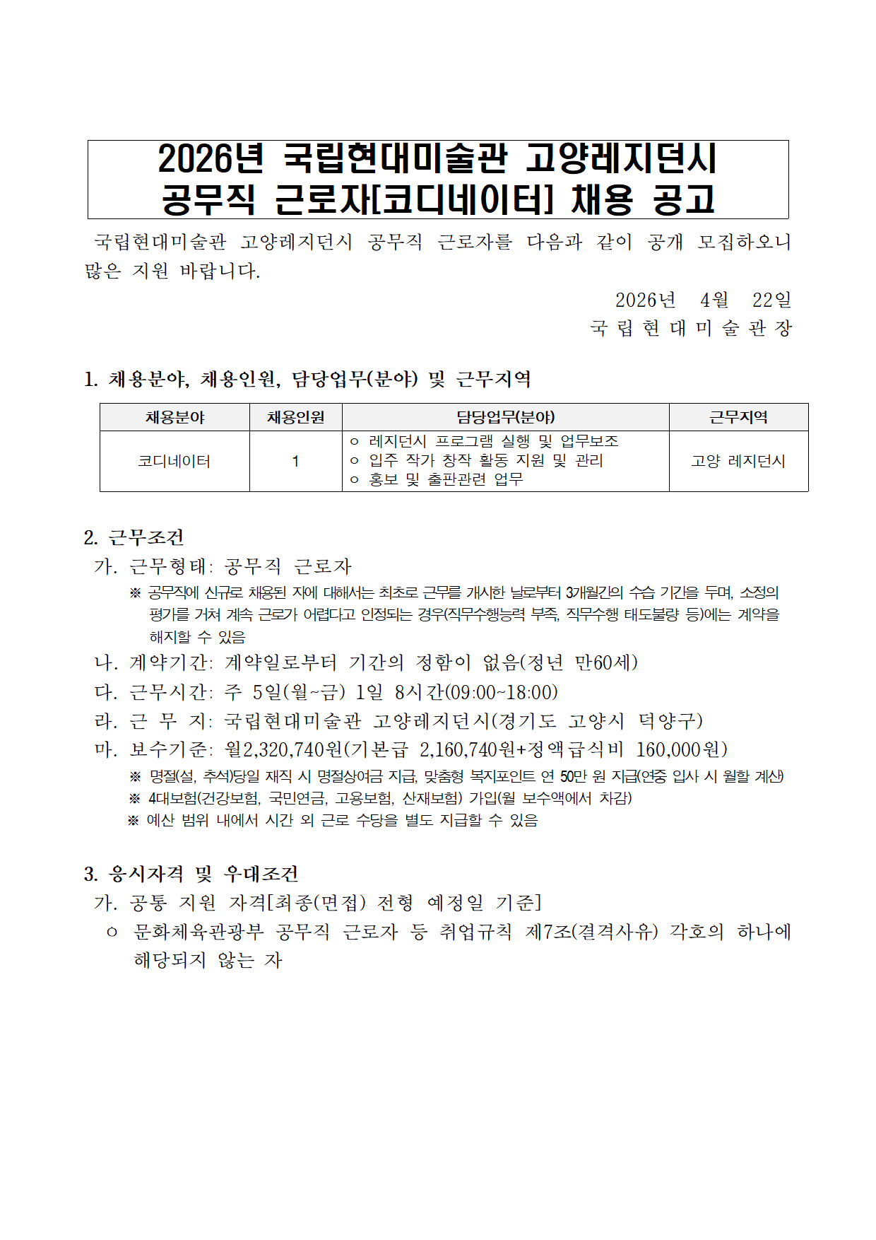 ±¹¸³Çö´ë¹Ì¼ú°ü °í¾ç·¹Áö´ø½Ã °ø¹«Á÷ ±Ù·ÎÀÚ[ÄÚµð³×ÀÌÅÍ] ä¿ë °ø°í