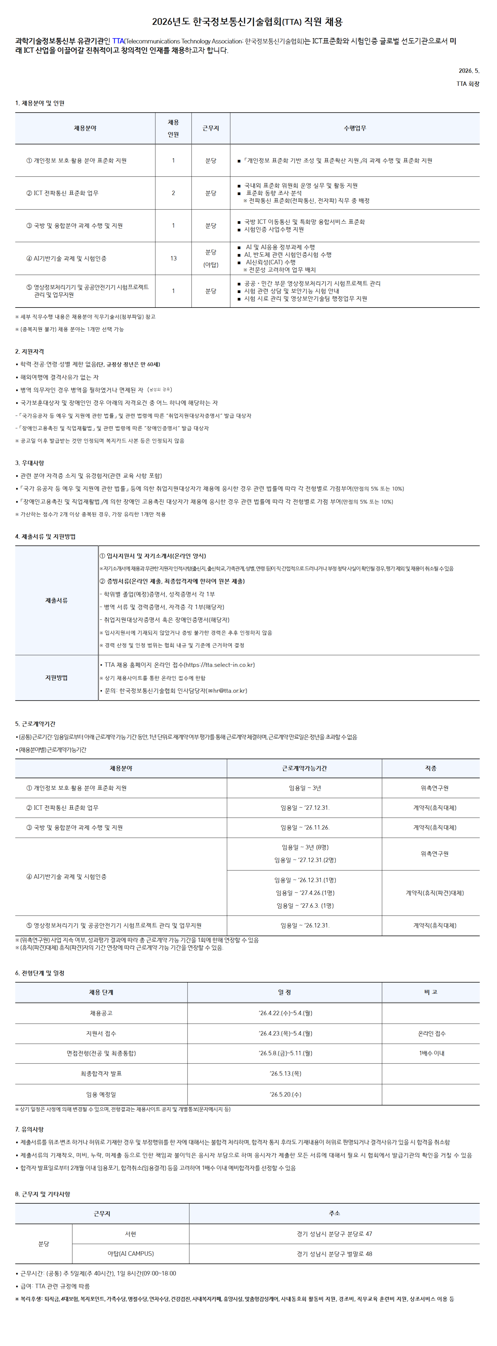 2026³âµµ Çѱ¹Á¤º¸Åë½Å±â¼úÇùȸ(TTA) Çùȸ Á÷¿ø ä¿ë(À§ÃË¡¤ÈÞÁ÷(ÆÄ°ß)´ëü)