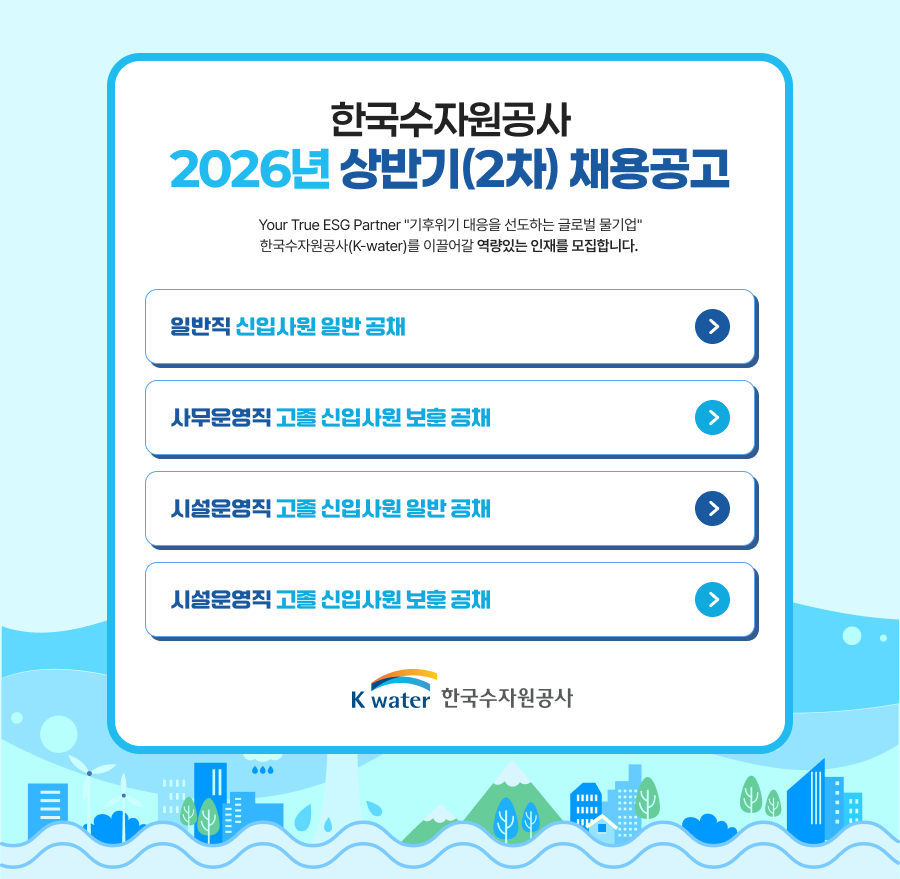 Çѱ¹¼öÀÚ¿ø°ø»ç(K-water)¸¦ À̲ø¾î°¥ ¿ª·®ÀÖ´Â ÀÎÀ縦 ¸ðÁýÇÕ´Ï´Ù.