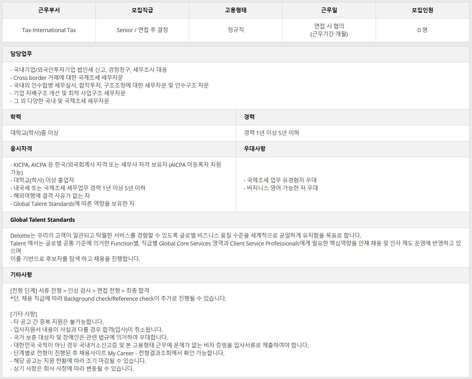 Á¢¼ö±â°£ 2026-04-23 00:00 ~ 2026-05-22 16:00 ±Þ¿©Á¶°Ç ȸ»ç ³»±Ô¿¡ µû¸§ ¸ðÁýºÎ¹® ÀÏ¹Ý ±Ù¹«Áö¿ª ¼­¿ï ¿©Àǵµ ÀüÇü´Ü°è ¼­·ù ÀüÇü ´ÙÀ½ÀüÇü ¸éÁ¢ ÀüÇü ´ÙÀ½ÀüÇü Àμº °Ë»ç ´ÙÀ½ÀüÇü ÃÖÁ¾ ÇÕ°Ý ´ÙÀ½ÀüÇü ÃÖÁ¾ ½ÂÀÎ ±Ù¹«ºÎ¼­ ¸ðÁýÁ÷±Þ °í¿ëÇüÅ ±Ù¹«ÀÏ ¸ðÁýÀοø Tax-International Tax Senior / ¸éÁ¢ ÈÄ °áÁ¤ Á¤±ÔÁ÷ ¸éÁ¢ ½Ã ÇùÀÇ (±Ù¹«±â°£ °³¿ù) 0 ¸í ´ã´ç¾÷¹« - ±¹³»±â¾÷/¿Ü±¹ÀÎÅõÀÚ±â¾÷ ¹ýÀμ¼ ½Å°í, °æÁ¤Ã»±¸, ¼¼¹«Á¶»ç ´ëÀÀ - Cross border °Å·¡¿¡ ´ëÇÑ ±¹Á¦Á¶¼¼ ¼¼¹«ÀÚ¹® - ±¹³»¿Ü ÀμöÇÕº´ ¼¼¹«½Ç»ç, ÇÕÀÛÅõÀÚ, ±¸Á¶Á¶Á¤¿¡ ´ëÇÑ ¼¼¹«ÀÚ¹® ¹× Àμö±¸Á¶ ÀÚ¹® - ±â¾÷ Áö¹è±¸Á¶ °³¼± ¹× ÃÖÀû »ç¾÷±¸Á¶ ¼¼¹«ÀÚ¹® - ±× ¿Ü ´Ù¾çÇÑ ±¹³» ¹× ±¹Á¦Á¶¼¼ ¼¼¹«ÀÚ¹® Çз °æ·Â ´ëÇб³(Çлç)Á¹ ÀÌ»ó °æ·Â 1³â ÀÌ»ó 5³â ÀÌÇÏ ÀÀ½ÃÀÚ°Ý ¿ì´ë»çÇ× - KICPA, AICPA µî Çѱ¹/¿Ü±¹È¸°è»ç ÀÚ°Ý ¶Ç´Â ¼¼¹«»ç ÀÚ°Ý º¸À¯ÀÚ (AICPA ¹Ìµî·ÏÀÚ Áö¿ø °¡´É) - ´ëÇб³(Çлç) ÀÌ»ó Á¹¾÷ÀÚ - ³»±¹¼¼ ¶Ç´Â ±¹Á¦Á¶¼¼ ¼¼¹«¾÷¹« °æ·Â 1³â ÀÌ»ó 5³â ÀÌÇÏ - ÇØ¿Ü¿©Çà¿¡ °á°Ý »çÀ¯°¡ ¾ø´Â ÀÚ - Global Talent Standards¿¡ µû¸¥ ¿ª·®À» º¸À¯ÇÑ ÀÚ - ±¹Á¦Á¶¼¼ ¾÷¹« À¯°æÇèÀÚ ¿ì´ë - ºñÁö´Ï½º ¿µ¾î °¡´ÉÇÑ ÀÚ ¿ì´ë Global Talent Standards Deloitte´Â ¿ì¸®ÀÇ °í°´ÀÌ ÀϰüµÇ°í Ź¿ùÇÑ ¼­ºñ½º¸¦ °æÇèÇÒ ¼ö ÀÖµµ·Ï ±Û·Î¹ú ºñÁî´Ï½º ǰÁú ¼öÁØÀ» ¼¼°èÀûÀ¸·Î ±ÕÀÏÇÏ°Ô À¯ÁöÇÔÀ» ¸ñÇ¥·Î ÇÕ´Ï´Ù. Talent ¿¡¼­´Â ±Û·Î¹ú °øÅë ±âÁØ¿¡ ÀǰÅÇÑ Functionº°, Á÷±Þº° Global Core Services ¿µ¿ª°ú Client Service Professionals¿¡°Ô ÇÊ¿äÇÑ Çٽɿª·®À» ÀÎÀç ä¿ë ¹× Àλç Á¦µµ ¿î¿µ¿¡ ¹Ý¿µÇϰí ÀÖÀ¸¸ç À̸¦ ±â¹ÝÀ¸·Î Èĺ¸ÀÚ¸¦ Ž»ö Çϰí ä¿ëÀ» ÁøÇàÇÕ´Ï´Ù. ±âŸ»çÇ× [ÀüÇü ´Ü°è] ¼­·ù ÀüÇü > Àμº °Ë»ç > ¸éÁ¢ ÀüÇü > ÃÖÁ¾ ÇÕ°Ý *´Ü, ä¿ë Á÷±Þ¿¡ µû¶ó Background check/Reference checkÀÌ Ãß°¡·Î ÁøÇàµÉ ¼ö ÀÖ½À´Ï´Ù. [±âŸ »çÇ×] - Ÿ °ø°í °£ Áߺ¹ Áö¿øÀº ºÒ°¡´ÉÇÕ´Ï´Ù. - ÀÔ»çÁö¿ø¼­ ³»¿ëÀÌ »ç½Ç°ú ´Ù¸¦ °æ¿ì ÇÕ°Ý(ÀÔ»ç)ÀÌ Ãë¼ÒµË´Ï´Ù. - ±¹°¡ º¸ÈÆ ´ë»óÀÚ ¹× Àå¾ÖÀÎÀº °ü·Ã ¹ý±Ô¿¡ ÀǰÅÇÏ¿© ¿ì´ëÇÕ´Ï´Ù. - ´ëÇѹα¹ ±¹ÀûÀÌ ¾Æ´Ñ °æ¿ì ±¹³»°Å¼Ò½Å°íÁõ ¹× º» °í¿ëÇüÅ ±Ù¹«¿¡ ¹®Á¦°¡ ¾ø´Â ºñÀÚ ÁõºùÀ» ÀԻ缭·ù·Î Á¦ÃâÇÏ¿©¾ß ÇÕ´Ï´Ù. - ´Ü°èº°·Î ÀüÇüÀÌ ÁøÇàµÈ ÈÄ Ã¤¿ë»çÀÌÆ® My Career - ÀüÇü°á°úÁ¶È¸¿¡¼­ È®ÀÎ °¡´ÉÇÕ´Ï´Ù. - ÇØ´ç °ø°í´Â Áö¿ø ÇöȲ¿¡ µû¶ó Á¶±â ¸¶°¨µÉ ¼ö ÀÖ½À´Ï´Ù. - »ó±â »çÇ×Àº ȸ»ç »çÁ¤¿¡ µû¶ó º¯µ¿µÉ ¼ö ÀÖ½À´Ï´Ù.
