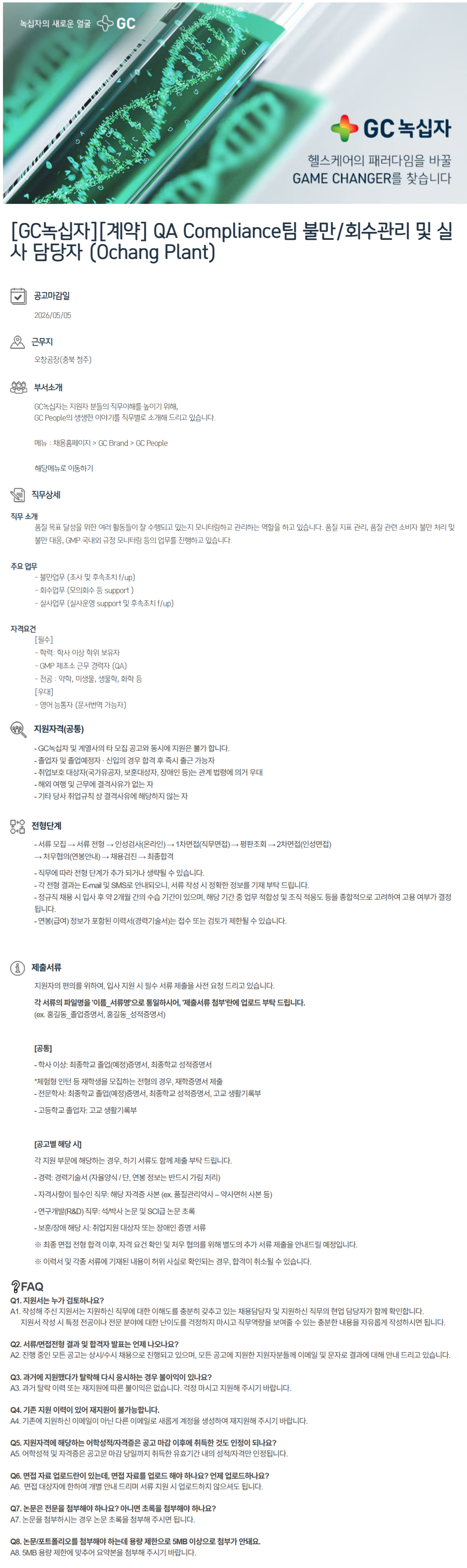 [GC³ì½ÊÀÚ][°è¾à] QA ComplianceÆÀ ºÒ¸¸/ȸ¼ö°ü¸® ¹× ½Ç»ç ´ã´çÀÚ (Ochang Plant)