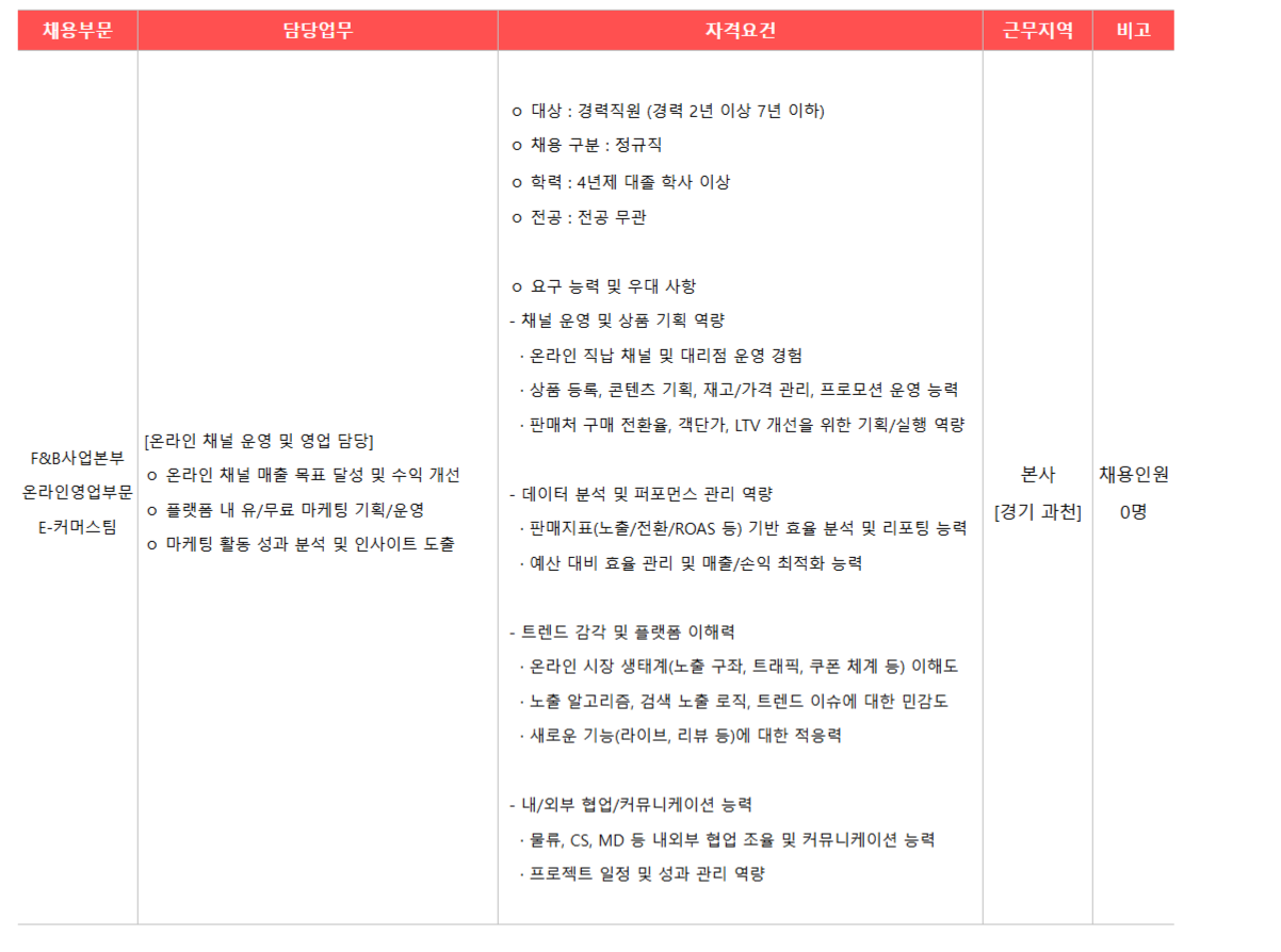 [±¤µ¿Á¦¾à] F&B»ç¾÷º»ºÎ ¿Â¶óÀοµ¾÷ºÎ¹® ¿Â¶óÀΠä³Î ¿µ¾÷ ´ã´ç °æ·ÂÁ÷¿ø ¸ðÁý