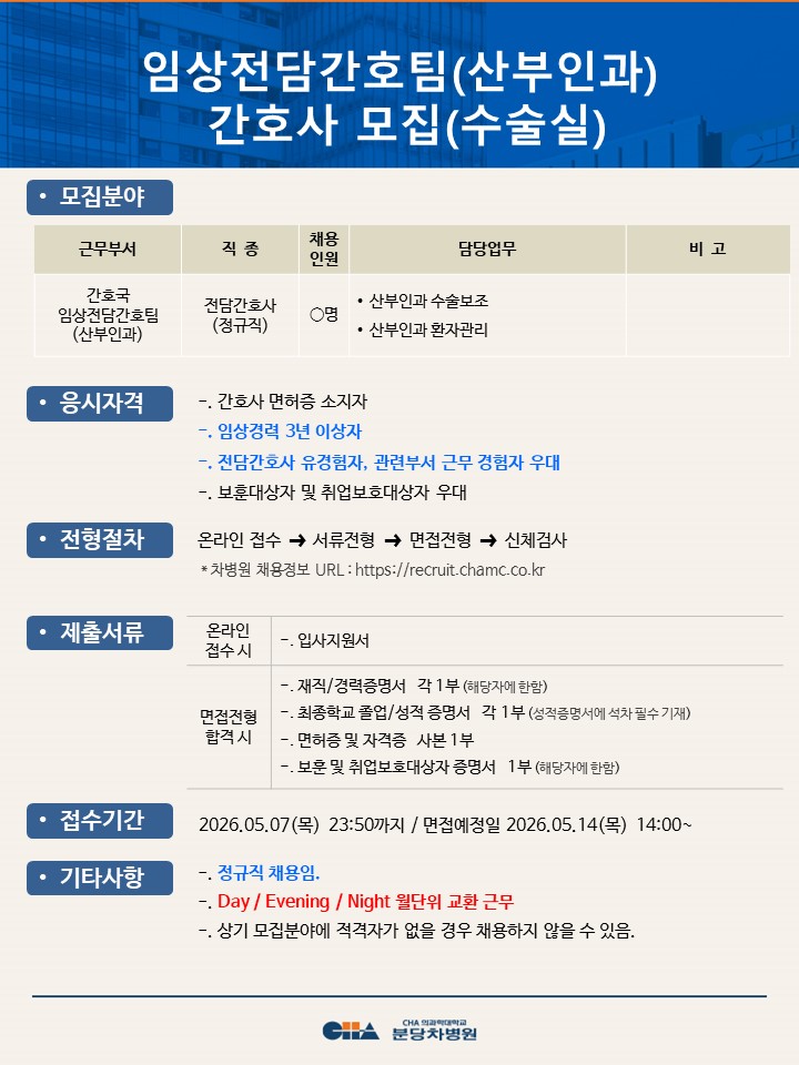[ºÐ´çÂ÷º´¿ø] ÀÓ»óÀü´ã°£È£ÆÀ(»êºÎÀΰú) °£È£»ç ¸ðÁý(¼ö¼ú½Ç)