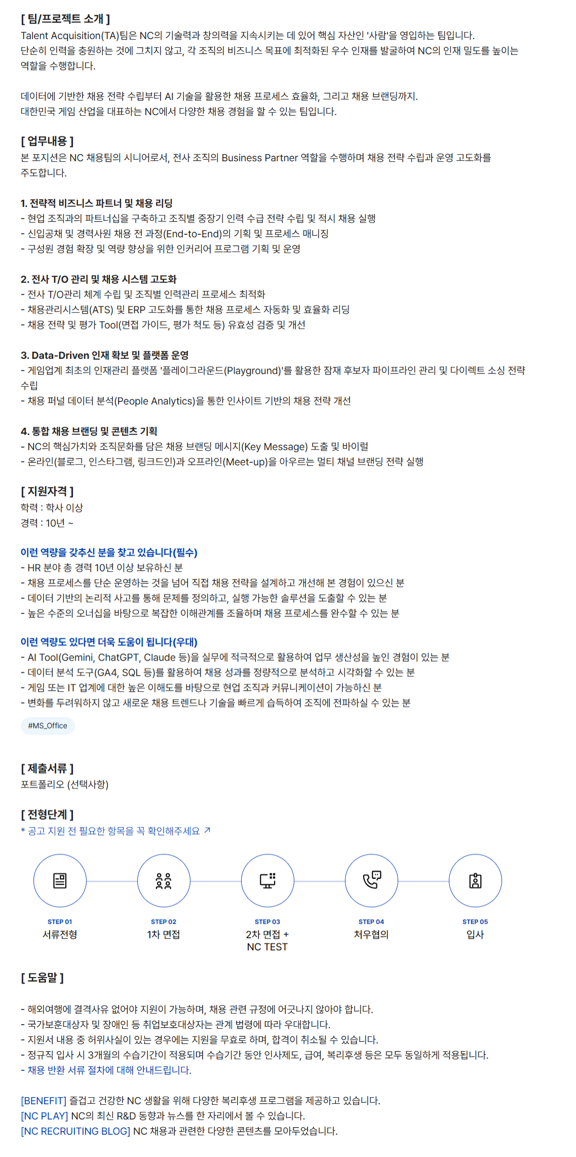 ´ëÇѹα¹ °ÔÀÓ »ê¾÷À» ´ëÇ¥ÇÏ´Â NC¿¡¼ ´Ù¾çÇÑ Ã¤¿ë °æÇèÀ» ÇÒ ¼ö ÀÖ´Â ÆÀÀÔ´Ï´Ù.