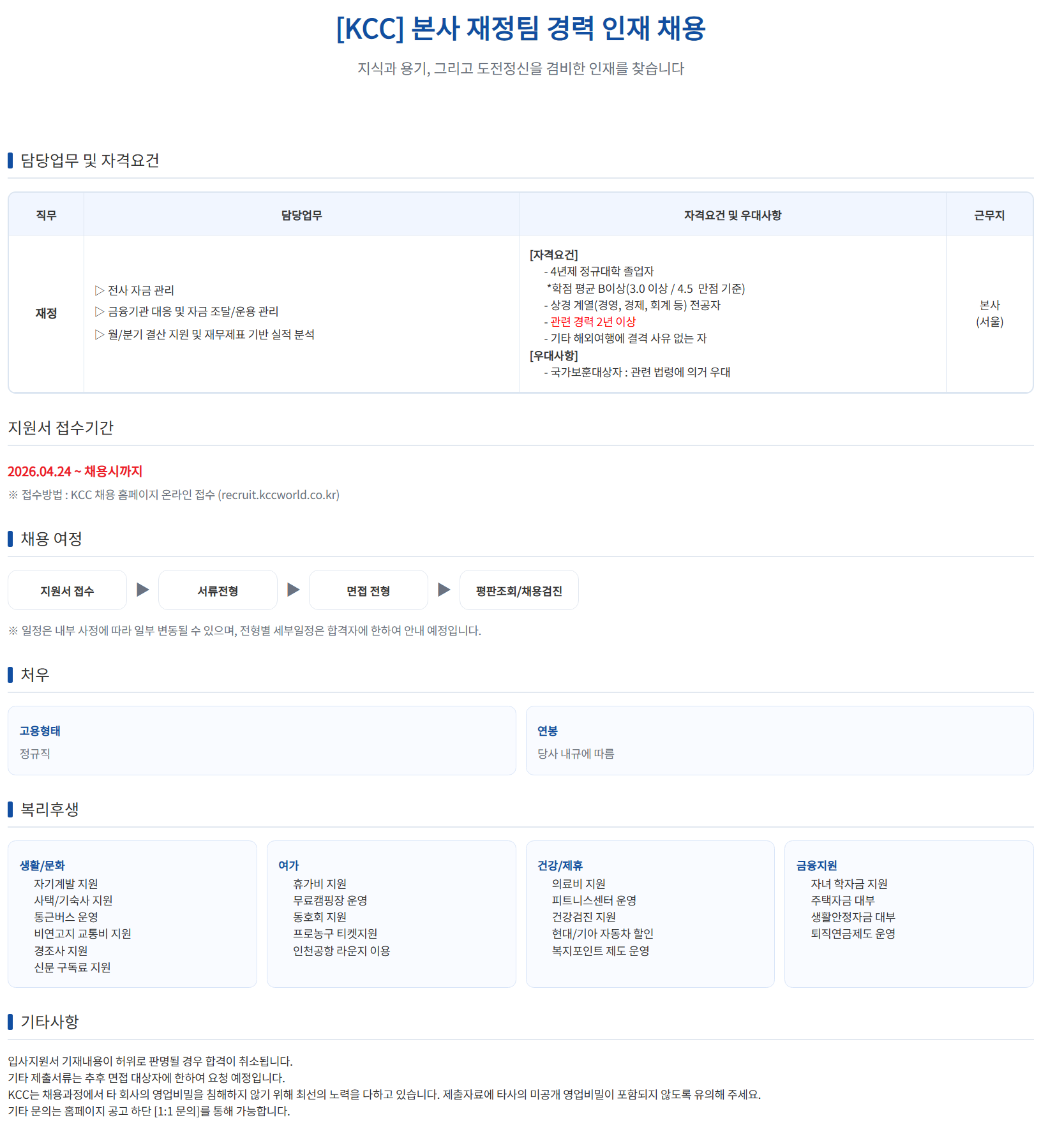 ´ã´ç¾÷¹« ¹× ÀÚ°Ý¿ä°Ç Á÷¹« ´ã´ç¾÷¹« ÀÚ°Ý¿ä°Ç ¹× ¿ì´ë»çÇ× ±Ù¹«Áö ÀçÁ¤ ¢¹ Àü»ç ÀÚ±Ý °ü¸® ¢¹ ±ÝÀ¶±â°ü ´ëÀÀ ¹× ÀÚ±Ý Á¶´Þ/¿î¿ë °ü¸® ¢¹ ¿ù/ºÐ±â °á»ê Áö¿ø ¹× À繫Á¦Ç¥ ±â¹Ý ½ÇÀû ºÐ¼® [ÀÚ°Ý¿ä°Ç] - 4³âÁ¦ Á¤±Ô´ëÇÐ Á¹¾÷ÀÚ *ÇÐÁ¡ Æò±Õ BÀÌ»ó(3.0 ÀÌ»ó / 4.5 ¸¸Á¡ ±âÁØ) - »ó°æ °è¿­(°æ¿µ, °æÁ¦, ȸ°è µî) Àü°øÀÚ - °ü·Ã °æ·Â 2³â ÀÌ»ó - ±âŸ ÇØ¿Ü¿©Çà¿¡ °á°Ý »çÀ¯ ¾ø´Â ÀÚ [¿ì´ë»çÇ×] - ±¹°¡º¸ÈÆ´ë»óÀÚ : °ü·Ã ¹ý·É¿¡ ÀǰŠ¿ì´ë º»»ç (¼­¿ï) Áö¿ø¼­ Á¢¼ö±â°£ 2026.04.24 ~ ä¿ë½Ã±îÁö ¡Ø Á¢¼ö¹æ¹ý : KCC ä¿ë ȨÆäÀÌÁö ¿Â¶óÀÎ Á¢¼ö (recruit.kccworld.co.k