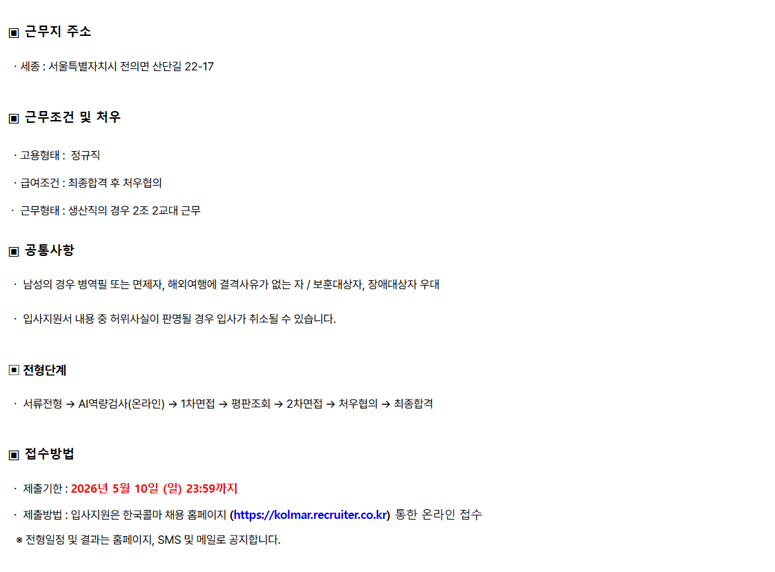 ¤ý Á¦Ãâ¹æ¹ý : ÀÔ»çÁö¿øÀº Çѱ¹Äݸ¶ ä¿ë ȨÆäÀÌÁö (https://kolmar.recruiter.co.kr) ÅëÇÑ ¿Â¶óÀÎ Á¢¼ö