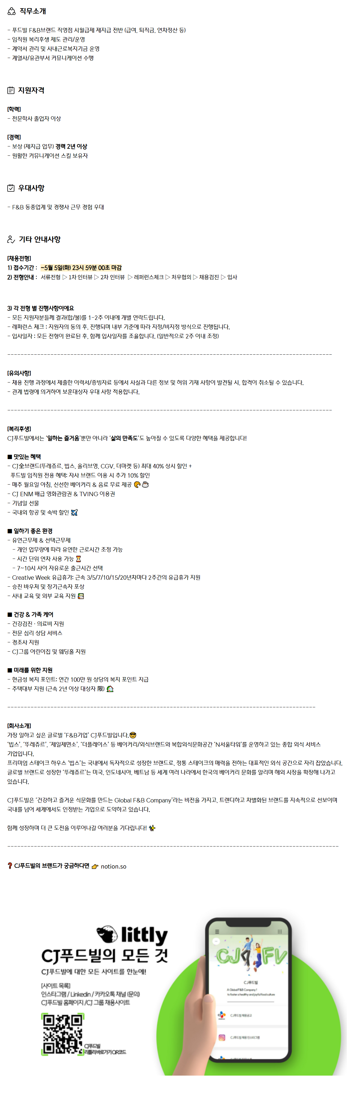 Á÷¹«¼Ò°³ - Ǫµåºô F&Bºê·£µå Á÷¿µÁ¡ ½Ã¿ù±ÞÁ¦ Á¦Áö±Þ Àü¹Ý (±Þ¿©, ÅðÁ÷±Ý, ¿¬Â÷Á¤»ê µî) - ÀÓÁ÷¿ø º¹¸®ÈÄ»ý Á¦µµ °ü¸®/¿î¿µ - °è¾à¼­ °ü¸® ¹× »ç³»±Ù·Îº¹Áö±â±Ý ¿î¿µ - °è¿­»ç/À¯°üºÎ¼­ Ä¿¹Â´ÏÄÉÀÌ¼Ç ¼öÇà