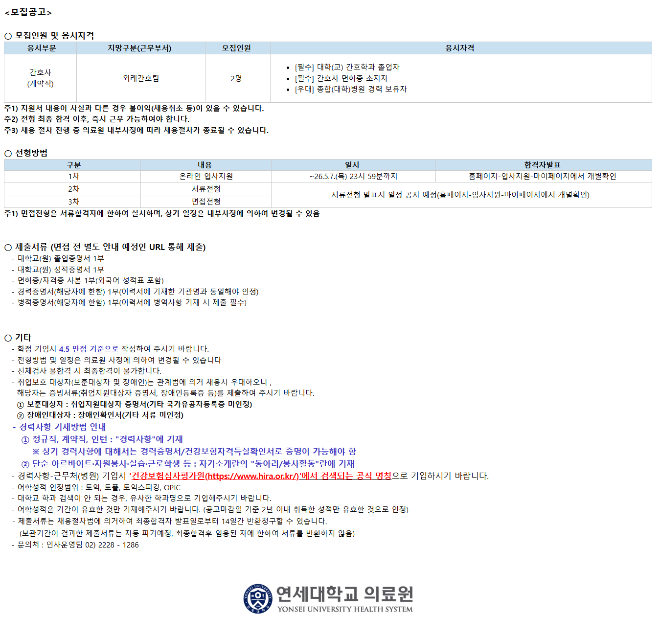 <¸ðÁý°ø°í> ¡Û ¸ðÁýÀοø ¹× ÀÀ½ÃÀÚ°Ý ÀÀ½ÃºÎ¹® Áö¸Á±¸ºÐ(±Ù¹«ºÎ¼­) ¸ðÁýÀοø ÀÀ½ÃÀÚ°Ý °£È£»ç (°è¾àÁ÷) ¿Ü·¡°£È£ÆÀ 2¸í [Çʼö] ´ëÇÐ(±³) °£È£Çаú Á¹¾÷ÀÚ [Çʼö] °£È£»ç ¸éÇãÁõ ¼ÒÁöÀÚ [¿ì´ë] Á¾ÇÕ(´ëÇÐ)º´¿ø °æ·Â º¸À¯ÀÚ ÁÖ1) Áö¿ø¼­ ³»¿ëÀÌ »ç½Ç°ú ´Ù¸¥ °æ¿ì ºÒÀÌÀÍ(ä¿ëÃë¼Ò µî)ÀÌ ÀÖÀ» ¼ö ÀÖ½À´Ï´Ù. ÁÖ2) ÀüÇü ÃÖÁ¾ ÇÕ°Ý ÀÌÈÄ, Áï½Ã ±Ù¹« °¡´ÉÇÏ¿©¾ß ÇÕ´Ï´Ù. ÁÖ3) ä¿ë ÀýÂ÷ ÁøÇà Áß ÀÇ·á¿ø ³»ºÎ»çÁ¤¿¡ µû¶ó ä¿ëÀýÂ÷°¡ Á¾·áµÉ ¼ö ÀÖ½À´Ï´Ù. ¡Û ÀüÇü¹æ¹ý ±¸ºÐ ³»¿ë ÀϽà ÇÕ°ÝÀÚ¹ßÇ¥ 1Â÷ ¿Â¶óÀÎ ÀÔ»çÁö¿ø ~26.5.7.(¸ñ) 23½Ã 59ºÐ±îÁö ȨÆäÀÌÁö-ÀÔ»çÁö¿ø-¸¶ÀÌÆäÀÌÁö¿¡¼­ °³º°È®ÀÎ 2Â÷ ¼­·ùÀüÇü ¼­·ùÀüÇü ¹ßÇ¥½Ã ÀÏÁ¤ °øÁö ¿¹Á¤(ȨÆäÀÌÁö-ÀÔ»çÁö¿ø-¸¶ÀÌÆäÀÌÁö¿¡¼­ °³º°È®ÀÎ) 3Â÷ ¸éÁ¢ÀüÇü ÁÖ1) ¸éÁ¢ÀüÇüÀº ¼­·ùÇÕ°ÝÀÚ¿¡ ÇÑÇÏ¿© ½Ç½ÃÇϸç, »ó±â ÀÏÁ¤Àº ³»ºÎ»çÁ¤¿¡ ÀÇÇÏ¿© º¯°æµÉ ¼ö ÀÖÀ½ ¡Û Á¦Ãâ¼­·ù (¸éÁ¢ Àü º°µµ ¾È³» ¿¹Á¤ÀÎ URL ÅëÇØ Á¦Ãâ) - ​´ëÇб³(¿ø) Á¹¾÷Áõ¸í¼­ 1ºÎ - ´ëÇб³(¿ø) ¼ºÀûÁõ¸í¼­ 1ºÎ - ¸éÇãÁõ/ÀÚ°ÝÁõ »çº» 1ºÎ(¿Ü±¹¾î ¼ºÀûÇ¥ Æ÷ÇÔ) - °æ·ÂÁõ¸í¼­(ÇØ´çÀÚ¿¡ ÇÑÇÔ) 1ºÎ(À̷¼­¿¡ ±âÀçÇÑ ±â°ü¸í°ú µ¿ÀÏÇØ¾ß ÀÎÁ¤) - º´ÀûÁõ¸í¼­(ÇØ´çÀÚ¿¡ ÇÑÇÔ) 1ºÎ(À̷¼­¿¡ º´¿ª»çÇ× ±âÀç ½Ã Á¦Ãâ Çʼö) ¡Û ±âŸ - ÇÐÁ¡ ±âÀԽà 4.5 ¸¸Á¡ ±âÁØÀ¸·Î ÀÛ¼ºÇÏ¿© Áֽñ⠹ٶø´Ï´Ù. - ÀüÇü¹æ¹ý ¹× ÀÏÁ¤Àº ÀÇ·á¿ø »çÁ¤¿¡ ÀÇÇÏ¿© º¯°æµÉ ¼ö ÀÖ½À´Ï´Ù - ½Åü°Ë»ç ºÒÇÕ°Ý ½Ã ÃÖÁ¾ÇÕ°ÝÀÌ ºÒ°¡ÇÕ´Ï´Ù. - Ãë¾÷º¸È£ ´ë»óÀÚ(º¸ÈÆ´ë»óÀÚ ¹× Àå¾ÖÀÎ)´Â °ü°è¹ý¿¡ ÀǰŠä¿ë½Ã ¿ì´ëÇÏ¿À´Ï , ÇØ´çÀÚ´Â Áõºù¼­·ù(Ãë¾÷Áö¿ø´ë»óÀÚ Áõ¸í¼­, Àå¾ÖÀεî·ÏÁõ µî)¸¦ Á¦ÃâÇÏ¿© Áֽñ⠹ٶø´Ï´Ù. ¨ç º¸ÈÆ´ë»óÀÚ : Ãë¾÷Áö¿ø´ë»óÀÚ Áõ¸í¼­(±âŸ ±¹°¡À¯°øÀÚµî·ÏÁõ ¹ÌÀÎÁ¤) ¨è Àå¾ÖÀδë»óÀÚ : Àå¾ÖÀÎÈ®Àμ­(±âŸ ¼­·ù ¹ÌÀÎÁ¤) - °æ·Â»çÇ× ±âÀç¹æ¹ý ¾È³» ¨ç Á¤±ÔÁ÷, °è¾àÁ÷, ÀÎÅÏ : "°æ·Â»çÇ×"¿¡ ±âÀç ¡Ø »ó±â °æ·Â»çÇ׿¡ ´ëÇØ¼­´Â °æ·ÂÁõ¸í¼­/°Ç°­º¸ÇèÀڰݵæ½ÇÈ®Àμ­·Î Áõ¸íÀÌ °¡´ÉÇØ¾ß ÇÔ ¨è ´Ü¼ø ¾Æ¸£¹ÙÀÌÆ®¡¤ÀÚ¿øºÀ»ç¡¤½Ç½À¡¤±Ù·ÎÇлý µî : ÀÚ±â¼Ò°³¶õÀÇ "µ¿¾Æ¸®/ºÀ»çȰµ¿"¶õ¿¡ ±âÀç - °æ·Â»çÇ×-±Ù¹«Ã³(º´¿ø) ±âÀԽà '°Ç°­º¸Çè½É»çÆò°¡¿ø(https://www.hira.or.kr/)'¿¡¼­ °Ë»öµÇ´Â °ø½Ä ¸íĪÀ¸·Î ±âÀÔÇϽñ⠹ٶø´Ï´Ù. - ¾îÇмºÀû ÀÎÁ¤¹üÀ§ : ÅäÀÍ, ÅäÇÃ, ÅäÀͽºÇÇÅ·, OPIC - ´ëÇб³ Çаú °Ë»öÀÌ ¾È µÇ´Â °æ¿ì, À¯»çÇÑ Çаú¸íÀ¸·Î ±âÀÔÇØÁֽñ⠹ٶø´Ï´Ù. - ¾îÇмºÀûÀº ±â°£ÀÌ À¯È¿ÇÑ °Í¸¸ ±âÀçÇØÁֽñ⠹ٶø´Ï´Ù. (°ø°í¸¶°¨ÀÏ ±âÁØ 2³â À̳» ÃëµæÇÑ ¼ºÀû¸¸ À¯È¿ÇÑ °ÍÀ¸·Î ÀÎÁ¤) - Á¦Ãâ¼­·ù´Â ä¿ëÀýÂ÷¹ý¿¡ ÀǰÅÇÏ¿© ÃÖÁ¾ÇÕ°ÝÀÚ ¹ßÇ¥ÀϷκÎÅÍ 14Àϰ£ ¹Ýȯû±¸ÇÒ ¼ö ÀÖ½À´Ï´Ù. (º¸°ü±â°£ÀÌ °á°úÇÑ Á¦Ãâ¼­·ù´Â ÀÚµ¿ ÆÄ±â¿¹Á¤, ÃÖÁ¾ÇÕ°ÝÈÄ ÀÓ¿ëµÈ ÀÚ¿¡ ÇÑÇÏ¿© ¼­·ù¸¦ ¹ÝȯÇÏÁö ¾ÊÀ½) - ¹®ÀÇó : Àλç¿î¿µÆÀ ***-****-****