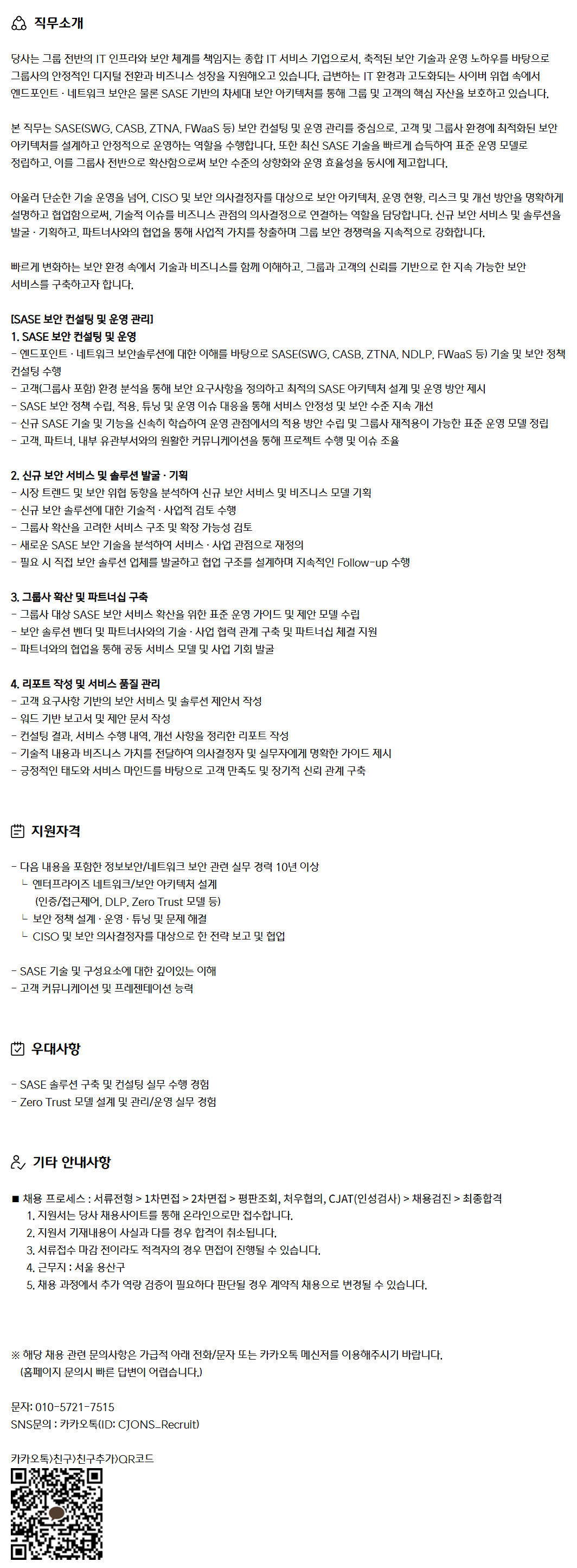 º» Á÷¹«´Â SASE(SWG, CASB, ZTNA, FWaaS µî) º¸¾È ÄÁ¼³ÆÃ ¹× ¿î¿µ °ü¸®¸¦ Áß½ÉÀ¸·Î, °í°´ ¹× ±×·ì»ç ȯ°æ¿¡ ÃÖÀûÈµÈ º¸¾È ¾ÆÅ°ÅØÃ³¸¦ ¼³°èÇÏ°í ¾ÈÁ¤ÀûÀ¸·Î ¿î¿µÇÏ´Â ¿ªÇÒÀ» ¼öÇàÇÕ´Ï´Ù. ¶ÇÇÑ ÃֽŠSASE ±â¼úÀ» ºü¸£°Ô ½ÀµæÇÏ¿© Ç¥ÁØ ¿î¿µ ¸ðµ¨·Î Á¤¸³Çϰí, À̸¦ ±×·ì»ç Àü¹ÝÀ¸·Î È®»êÇÔÀ¸·Î½á º¸¾È ¼öÁØÀÇ »óÇâÈ¿Í ¿î¿µ È¿À²¼ºÀ» µ¿½Ã¿¡ Á¦°íÇÕ´Ï´Ù.